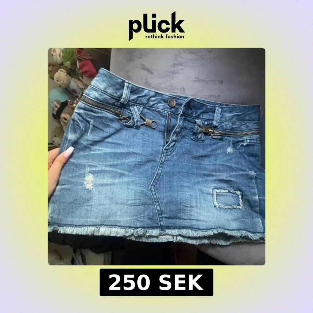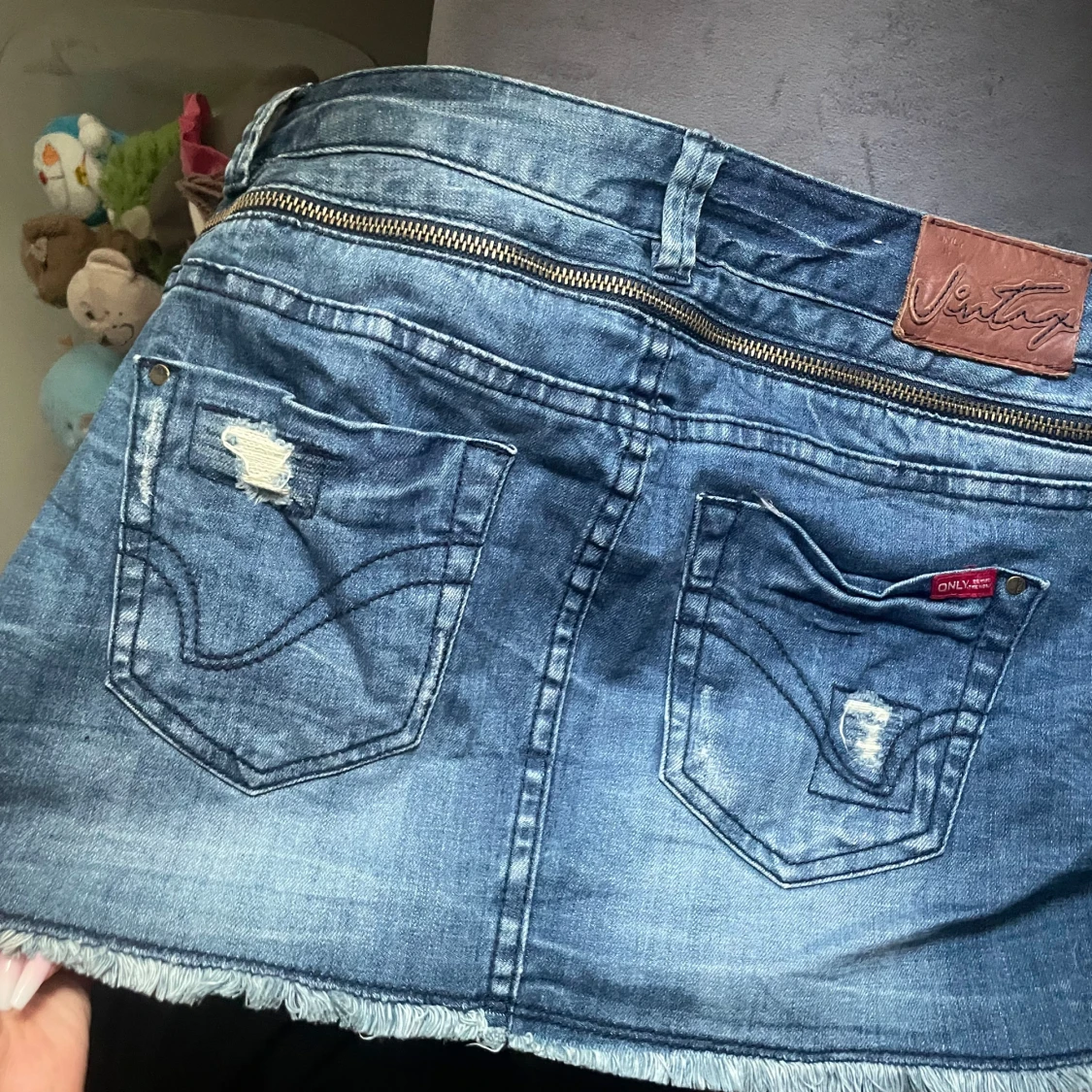 Snygg blå jeanskjol från Only med slitna detaljer, rå kant nertill och coola dragkedjor framtill. Kjolen har bälteshällor, fickor både fram och bak samt en patch med 'vintage' på baksidan. Perfekt för en chill och trendig look.