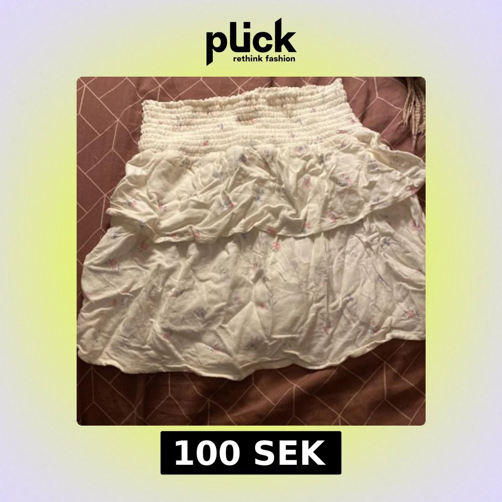 Supersöt vit kortkjol med små blommor i rosa och blått. Kjolen har bred smockresår i midjan och dubbla volanger för extra flowy känsla. Perfekt för dig som gillar romantisk och feminin stil.