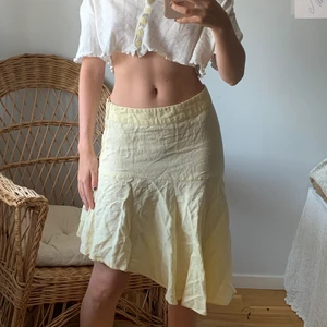 jättefin och unik kjol! vill påstå att det är linne, men kan ej garantera eftersom lappen är bortklippt. storlek står inte heller längre, den passar mig perfekt som har S och 89 i höftmått samt 66 i midjemått!