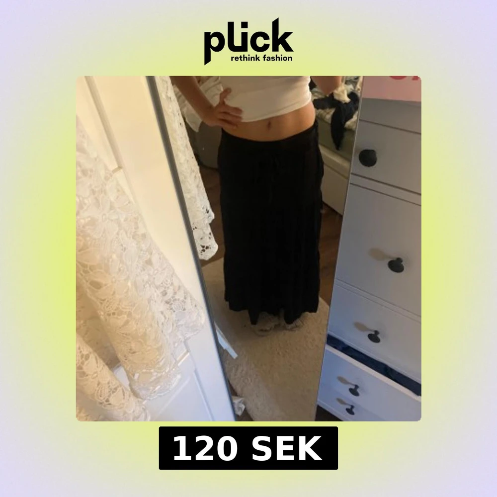 Säljer en svart långkjol med volanger och knytband i midjan. Även fickor på båda sidorna vilket är jätte smidigt. Aldrig använd.