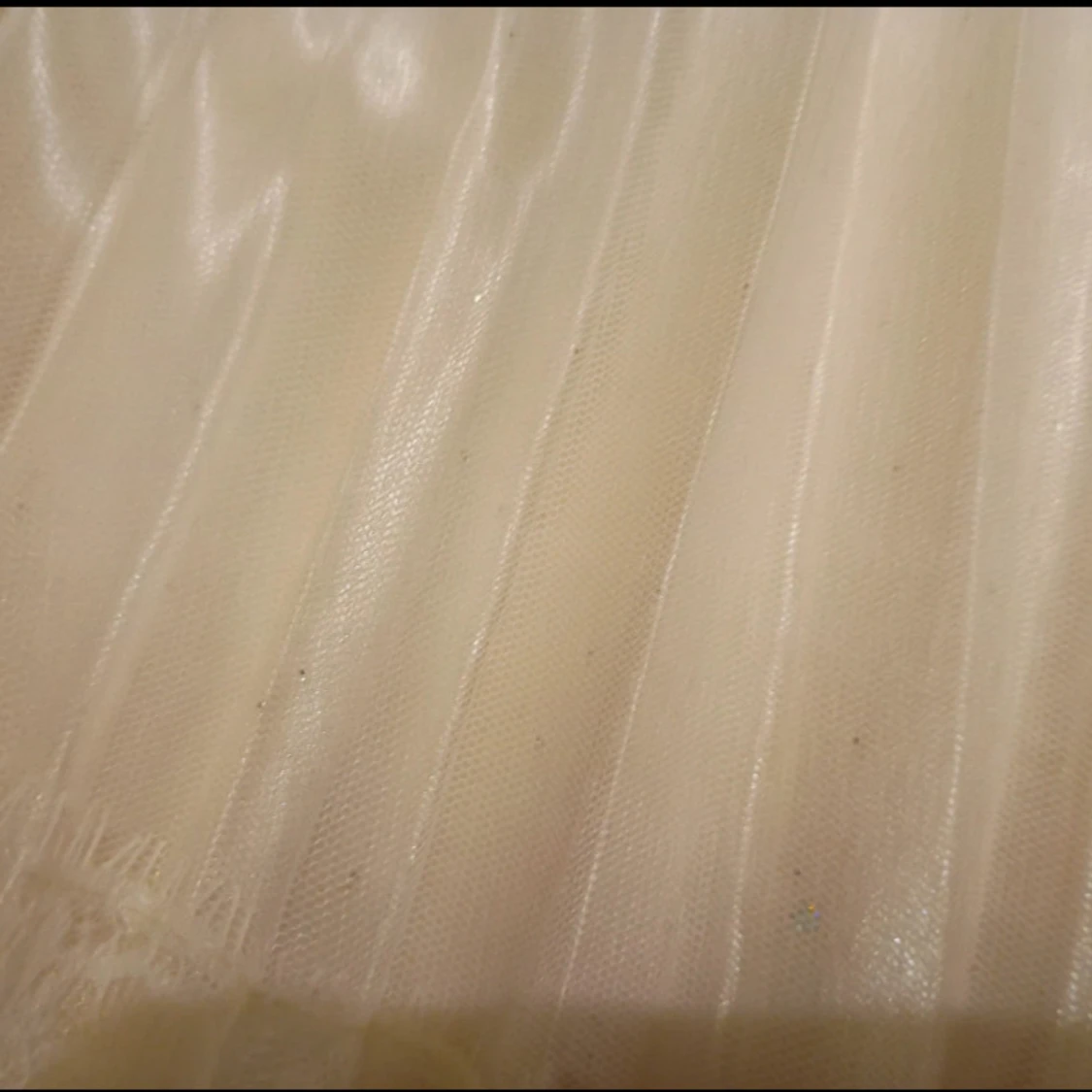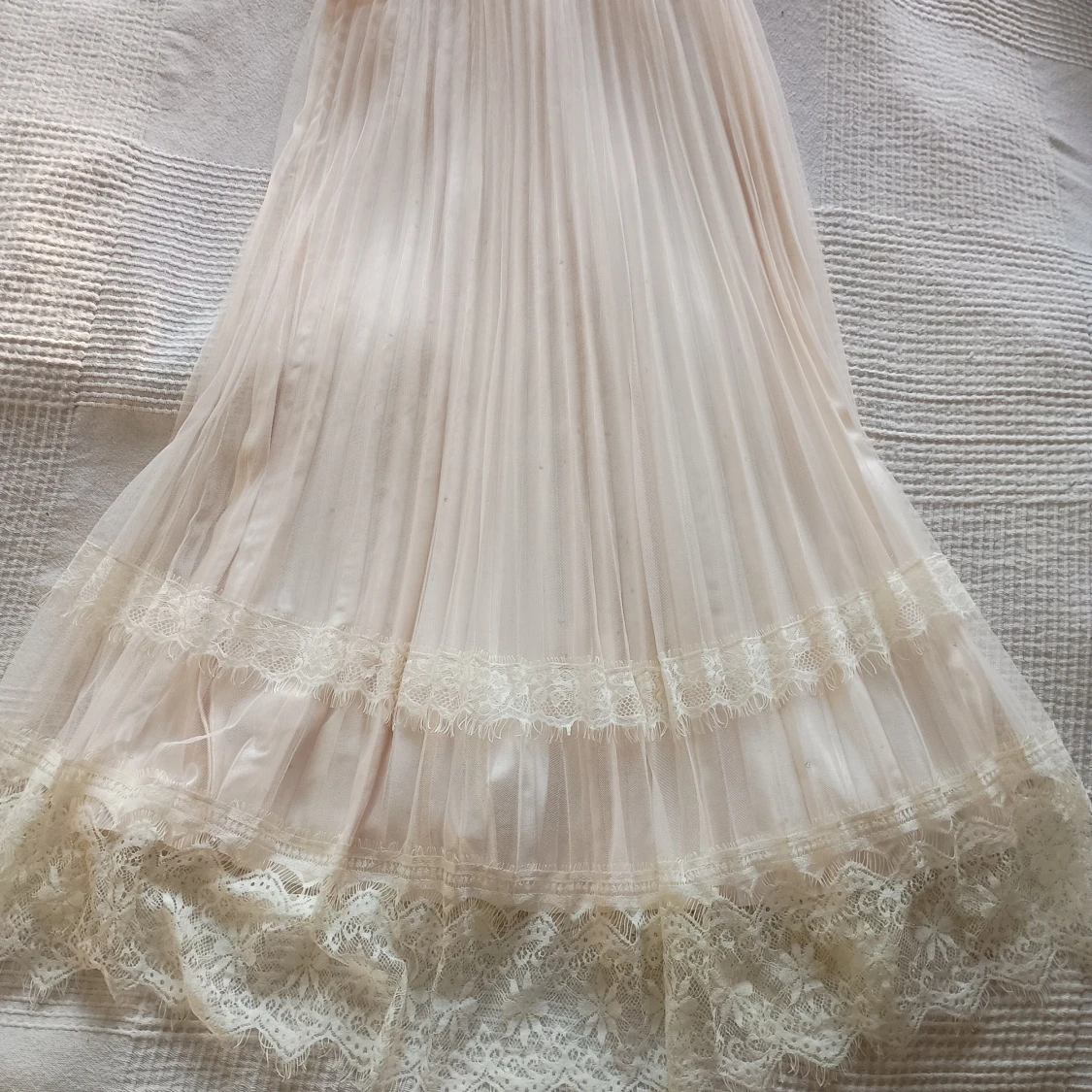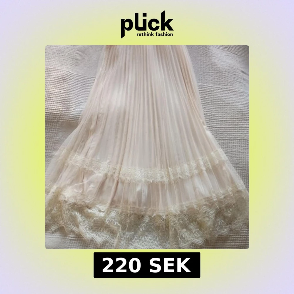 Elegant champagnefärgad kjol med vackra spetsdetaljer och ett skirt, glansigt material. Ubderkjole. Har holografiskt glitter som skimmrar igenom Perfekt för speciella tillfällen med sin romantiska och dömlika stil.