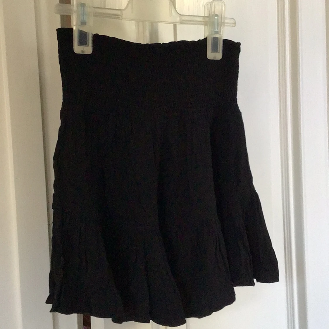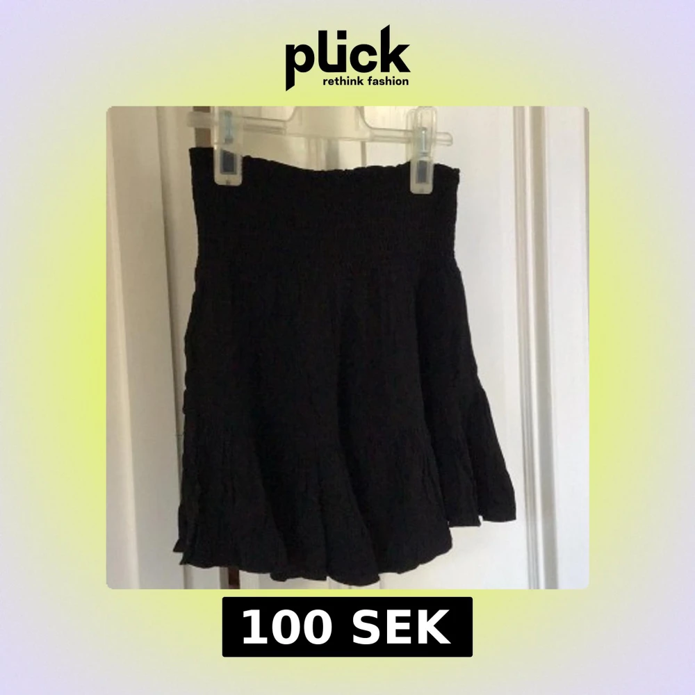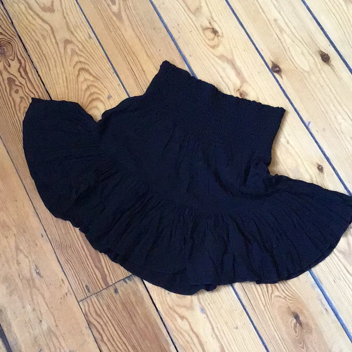 Säljer en svart kortkjol med volangdetaljer. Kjolen har en elastisk midja som ger en bekväm passform. Perfekt för att skapa en stilren look.