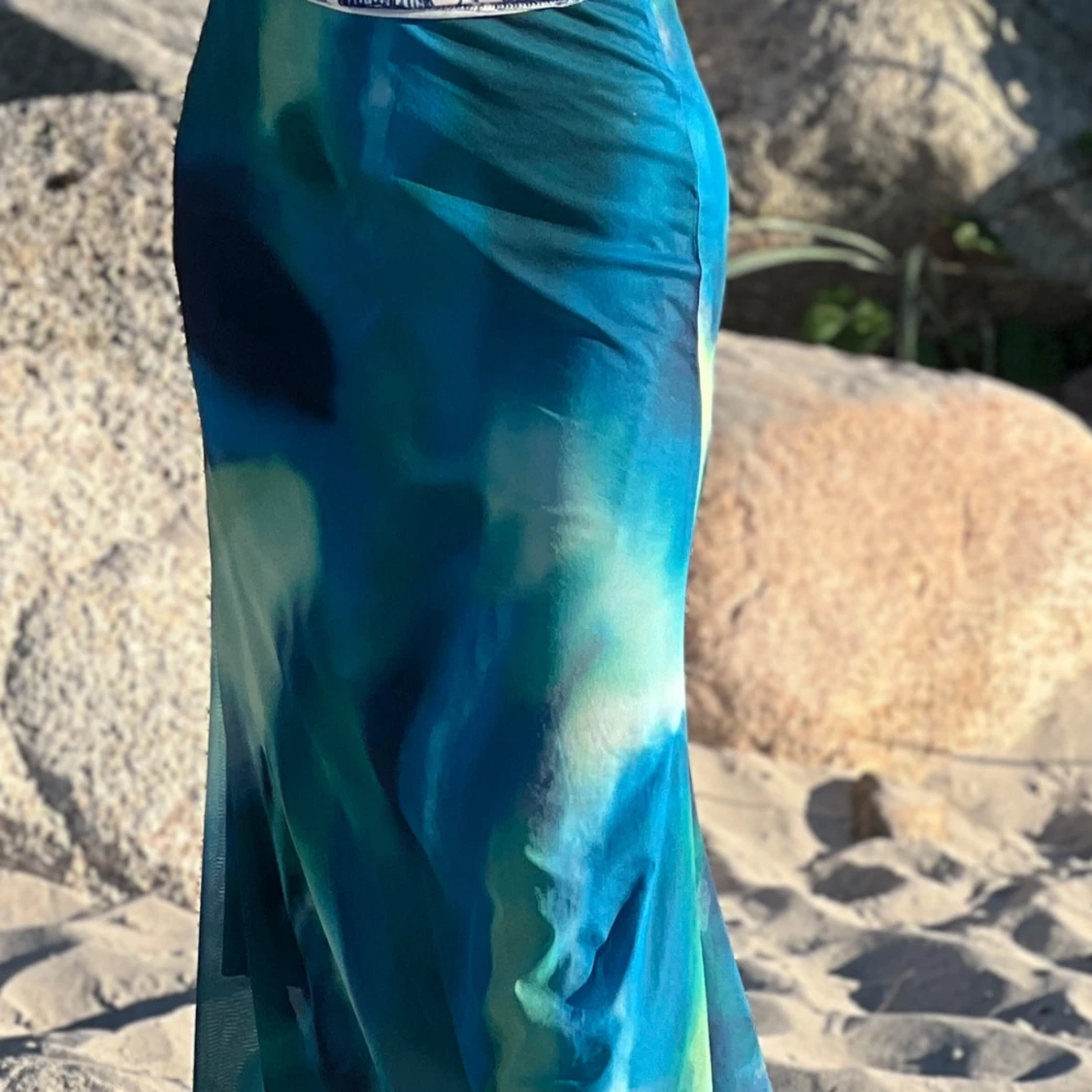 Säljer en snygg långklänning med blått och vitt mönster upptill och blågrön tonad kjol. Klänningen har smala axelband och figurnära passform. Perfekt för sommarens alla tillfällen!