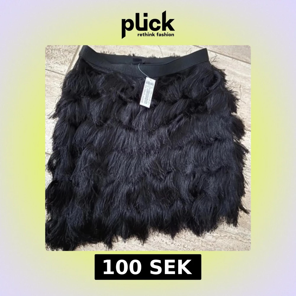 Säljer en svart kjol med långa, fluffiga pälsdetaljer som ger en cool och unik look. Kjolen har resår i midjan och är perfekt för dig som vill sticka ut. Passar till många olika stilar och är ett riktigt statement-plagg. Passar s-m