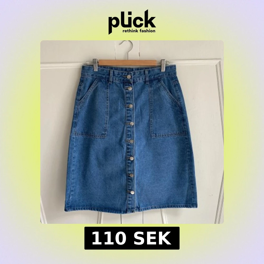 Snygg blå jeanskjol med knappar hela vägen fram och praktiska fickor både fram och bak. Kjolen har en klassisk design med bälteshällor i en denim utan stretch. Passar bra till en enkel t-shirt eller en stickad tröja. Midja 79 cm, längd 62. Står storlek L men är nog snarare S/XS. Aldrig använd.