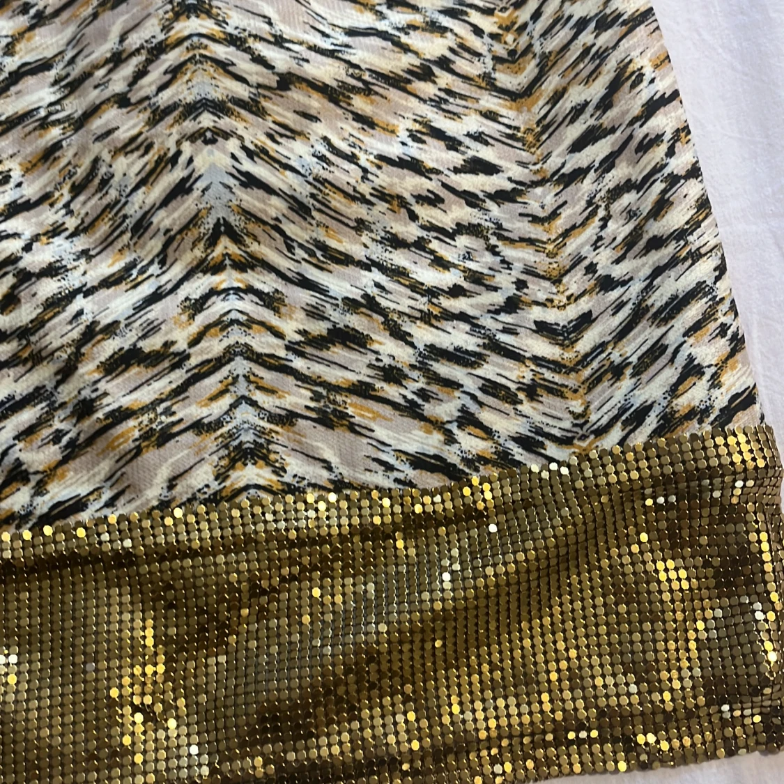 Säljer en kort kjol med ett coolt zebramönster i svart, beige och guld. Nederkanten är täckt av glittriga guldpaljetter som ger extra bling. Kjolen har en rak passform och är perfekt för dig som gillar att sticka ut med din stil.