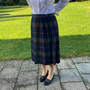 Tartarmönstrad skotsk kjol i ren skotsk ull. Blå och grön med bruna, gula och röda inslag. gMidjemått 88-90 cm. Går att justera.Längd : 70 cm.