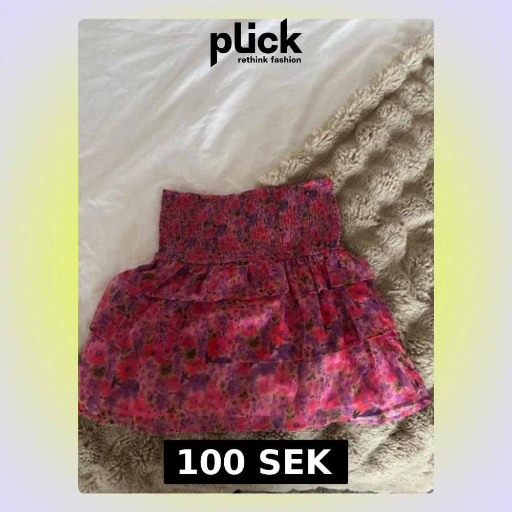 Supersöt kort kjol från BikBok med blommigt mönster i rosa, lila och röda toner. Kjolen har bred smock i midjan och flera lager volanger för en flowy look. Perfekt för sommarens alla äventyr!