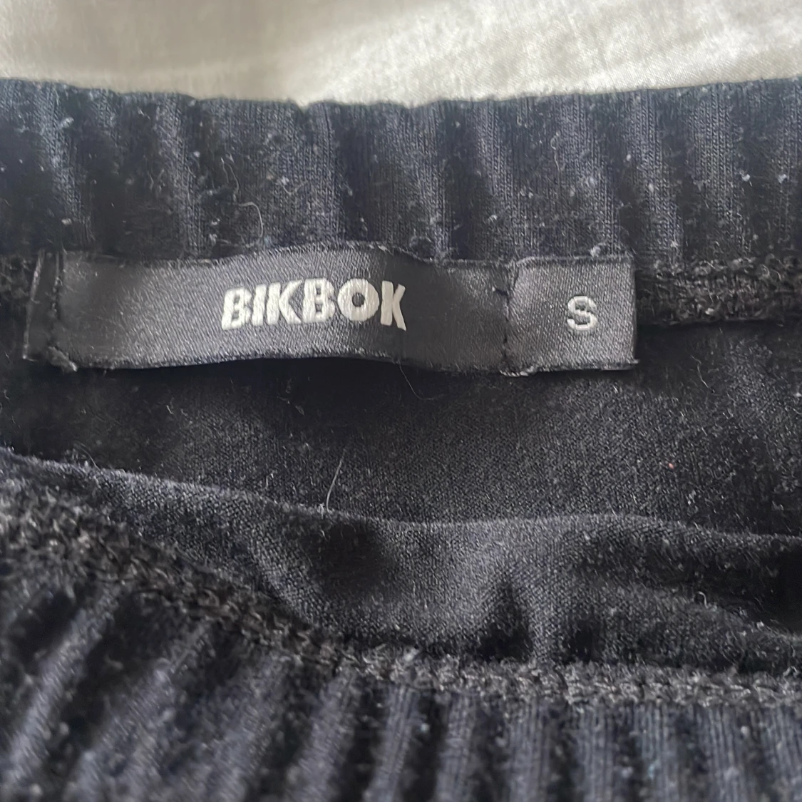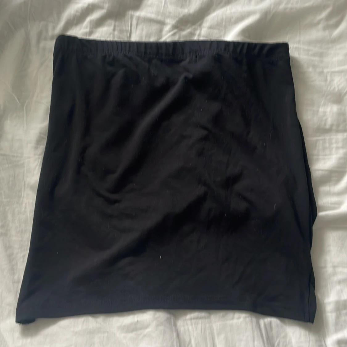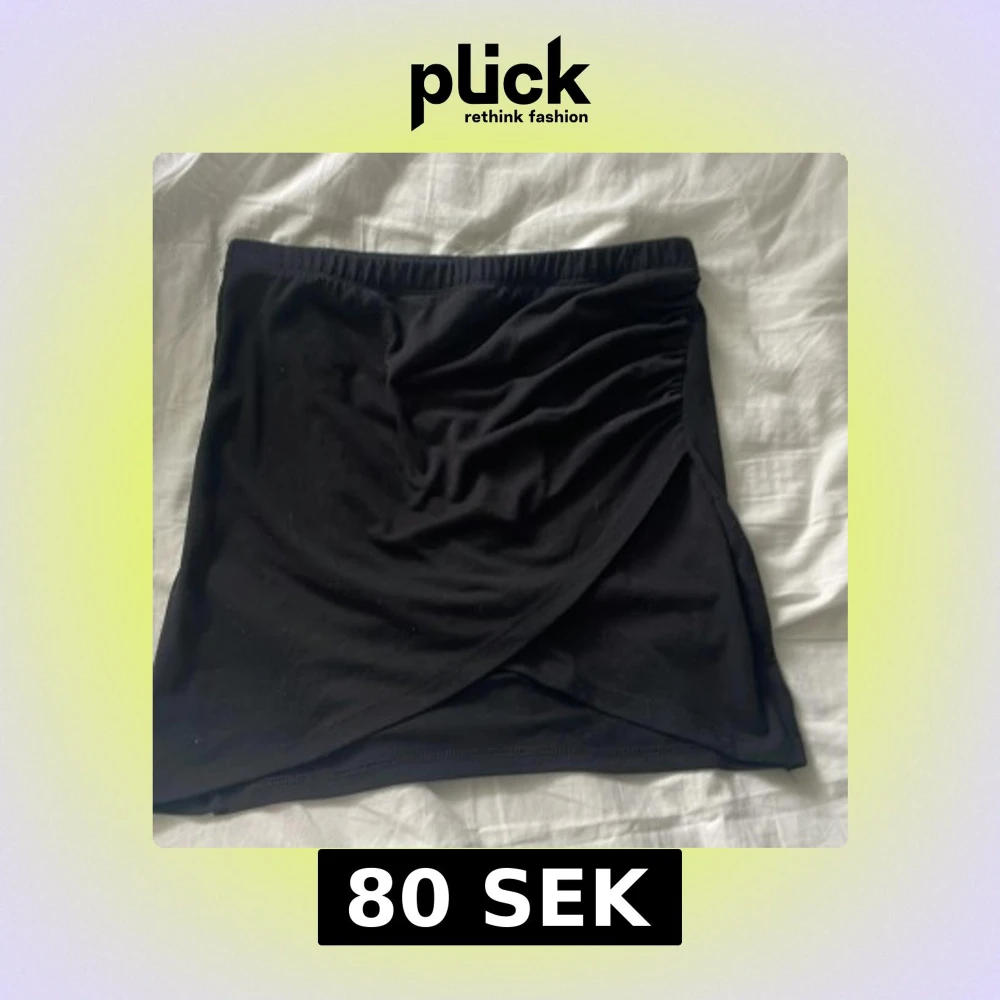 Svart kortkjol från BikBok i mjukt bomullsmaterial. Kjolen har omlottdesign framtill och resår i midjan för en bekväm passform. Lite nopprar på en av sidorna och inuti vid midjan men inget som syns tydligt. Säljer då den är förstor