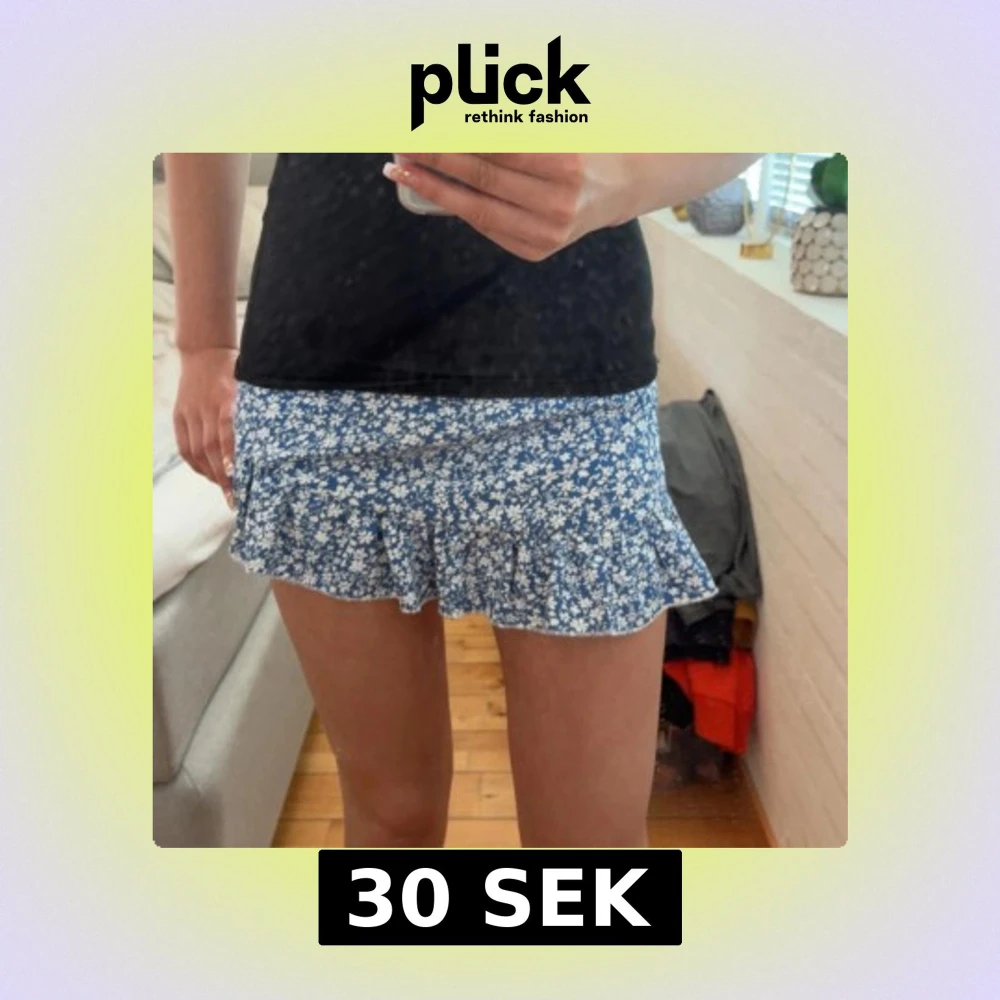 Supersöt kort blå kjol med vitt blommönster och volangkant från shein. Kjolen har en lätt utsvängd form och sitter snyggt i midjan. Den är högmidjad men jag har dragit tröjan över💞köparen står för frakt!