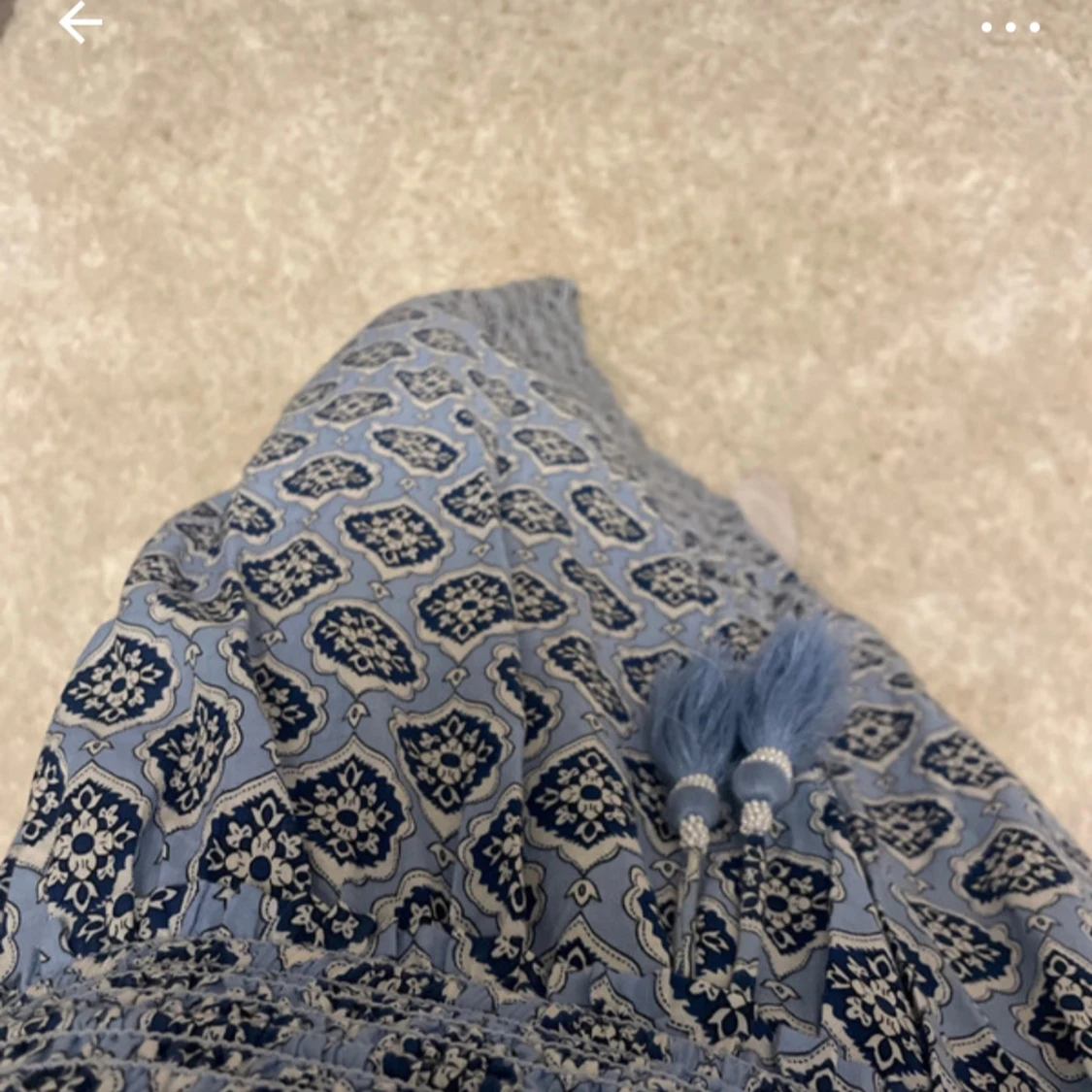 Säljer en blå långkjol med vitt och mörkblått mönster. Kjolen har resår i midjan och dekorativa blå tofsar framtill. Perfekt för dig som gillar bohemisk stil och vill ha något luftigt och snyggt. Bilderna är från min vinted❤️