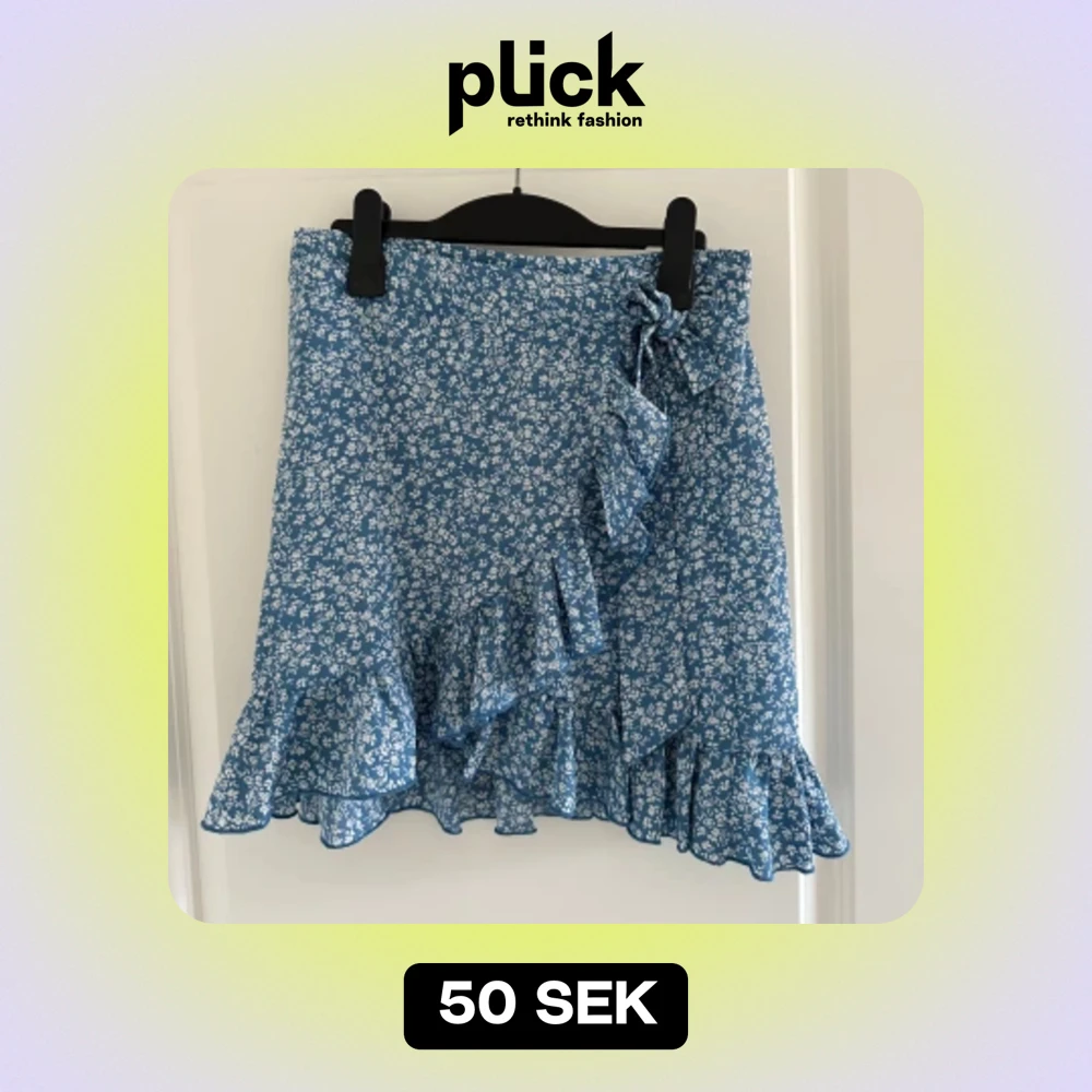 Säljer en superfin blå kjol med vitt blommönster. Kjolen har en söt volangdetalj och knytning i midjan. Perfekt för sommardagar eller en festlig kväll! Den är i nyskick och har en omlott-design som ger en fin passform.