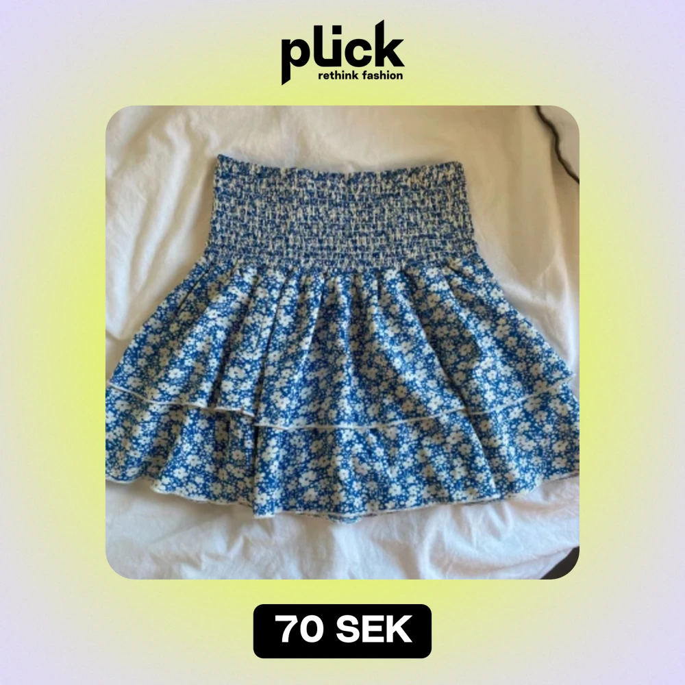 blå volangkjol med blommor storlek s men är stretchig så allt från xs-l borde passa bara skriva privat om ni har frågor