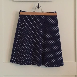 Prickig, mörkblå kjol. Köpt second hand men aldrig använd, så toppenskick. Verkar vara handsydd så står ingen storlek, skulle säga XS, mäter 31cm rakt över midjan.