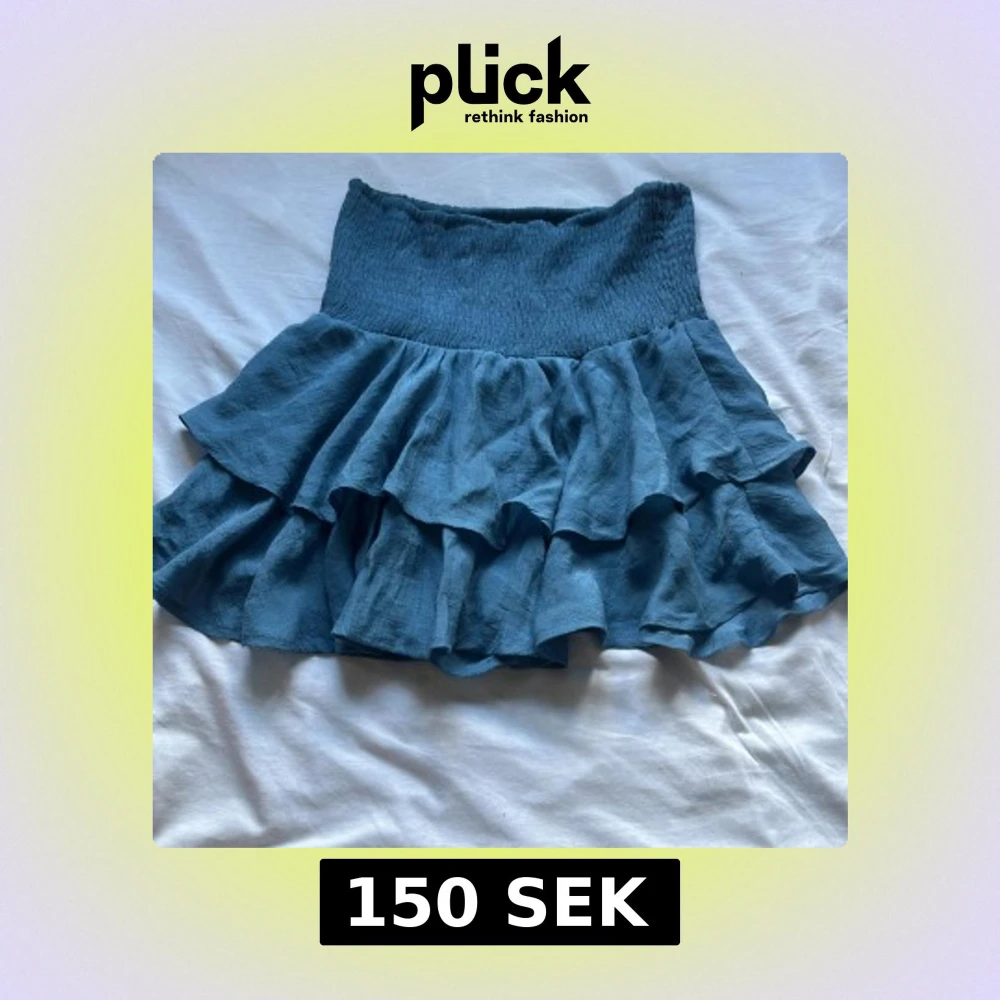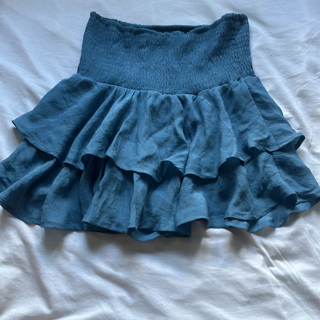 Supersöt blå kortkjol med bred smock i midjan och dubbla volanger. Kjolen har en luftig känsla och är knappt använd. Här av dog vid prosförsöag pch frågor!