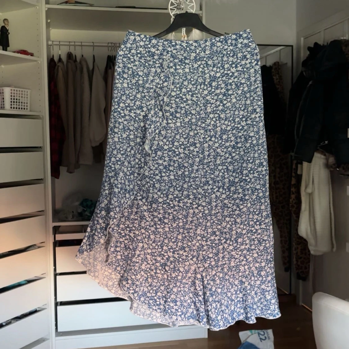 Supersöt långkjol från SHEIN i blått med vitt blommönster. Kjolen har en lätt volang nertill och omlottkänsla i snittet. Perfekt för dig som gillar en flowy och feminin stil. Materialet är mjukt och lätt, perfekt för varmare dagar.