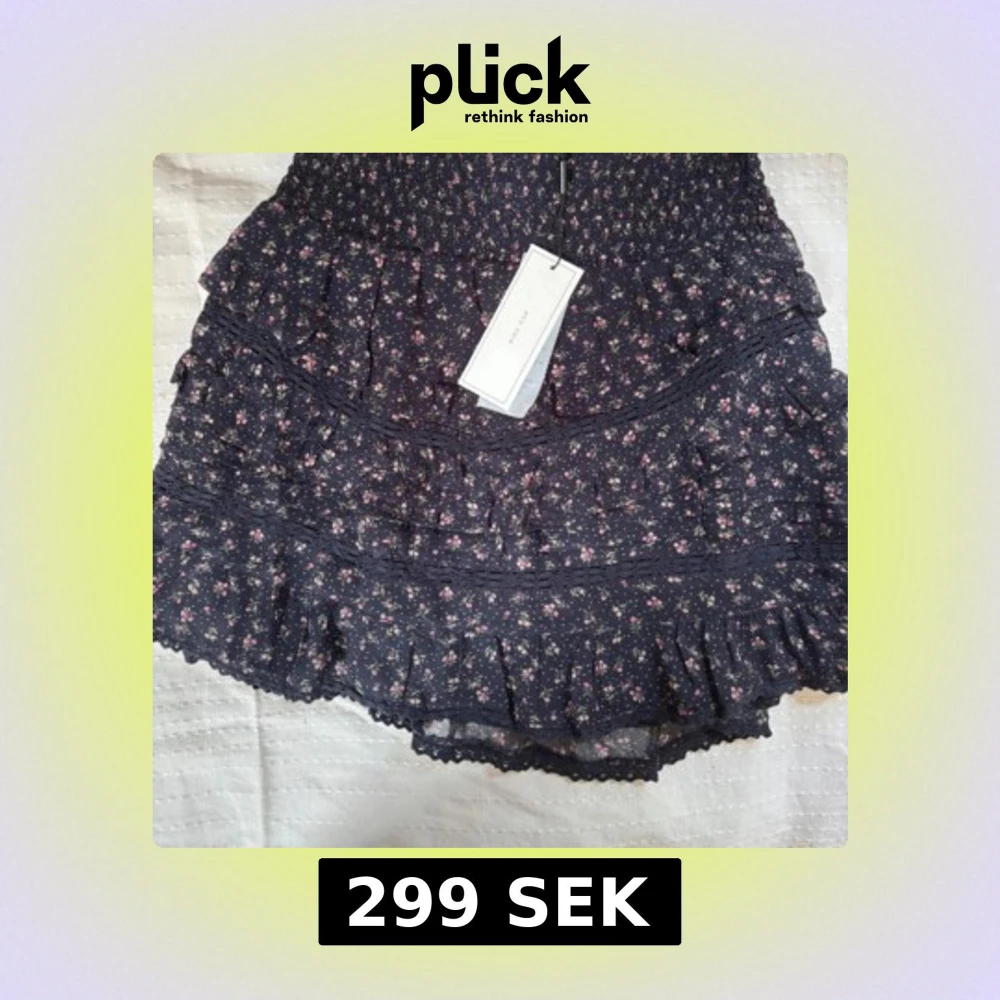 Supersöt svart kortkjol från Neo Noir i storlek 34 med små blommor i rosa och grönt. Kjolen har flera volanger, smock i midjan och spetsdetaljer längs kanterna. Helt ny med prislappen kvar💕