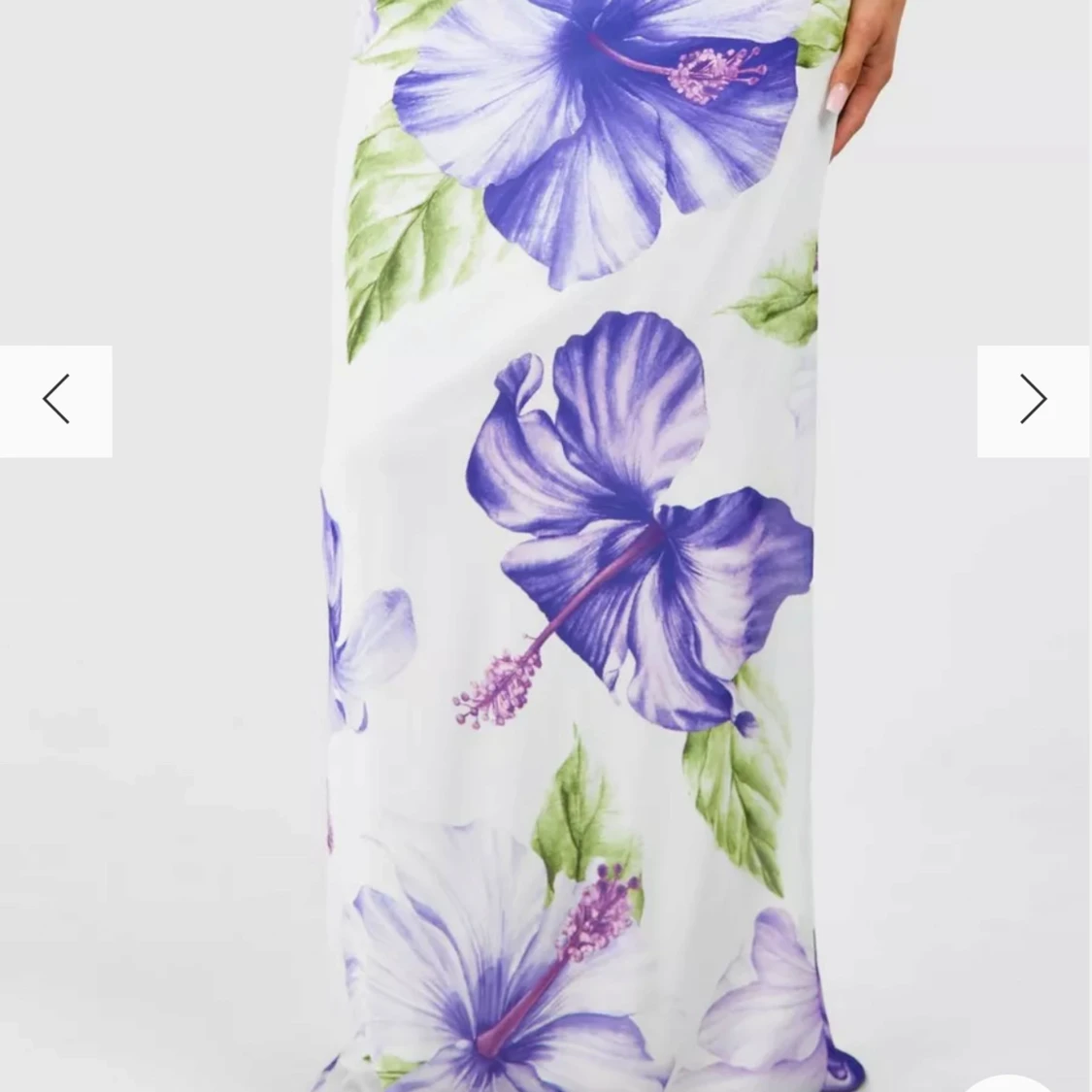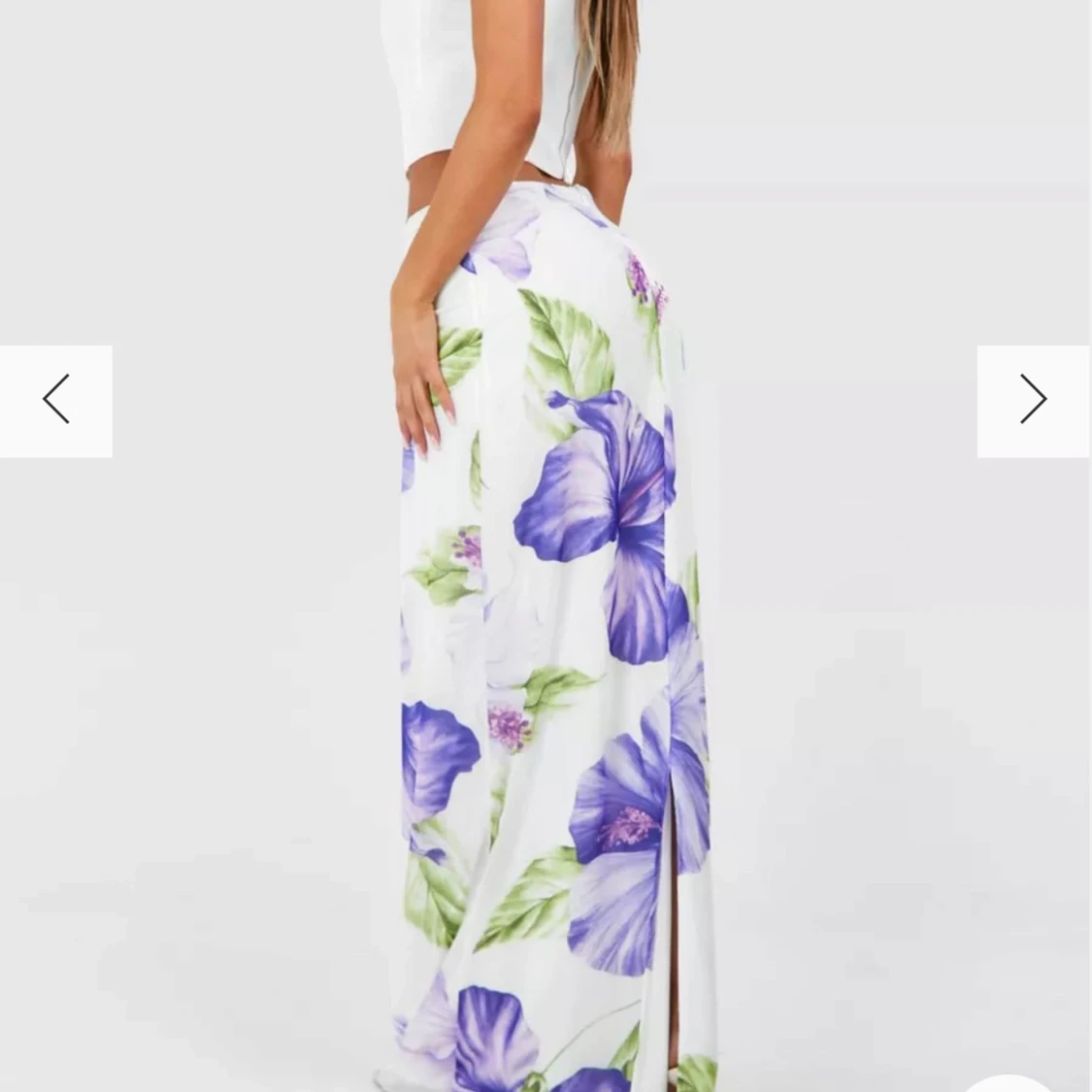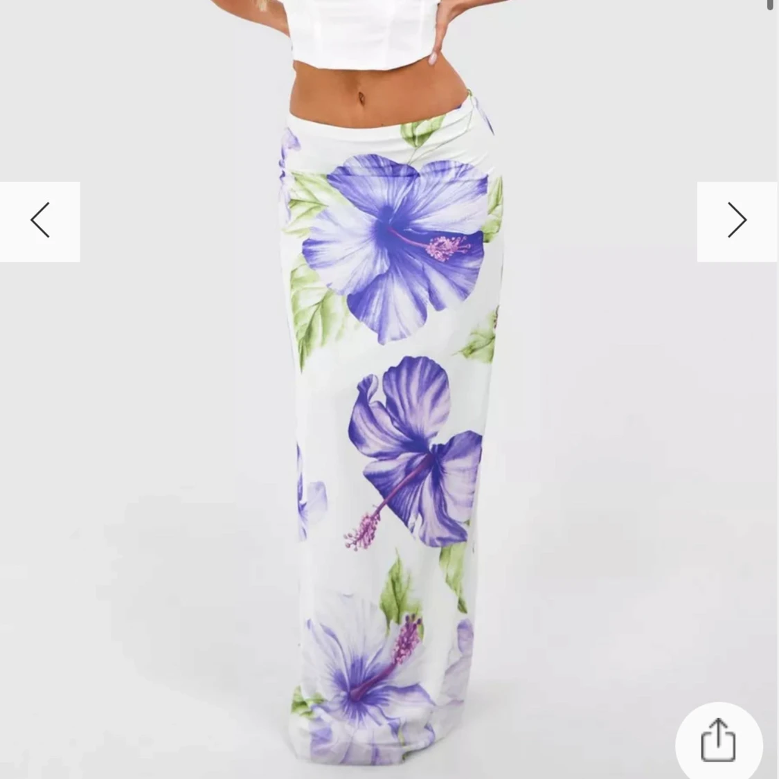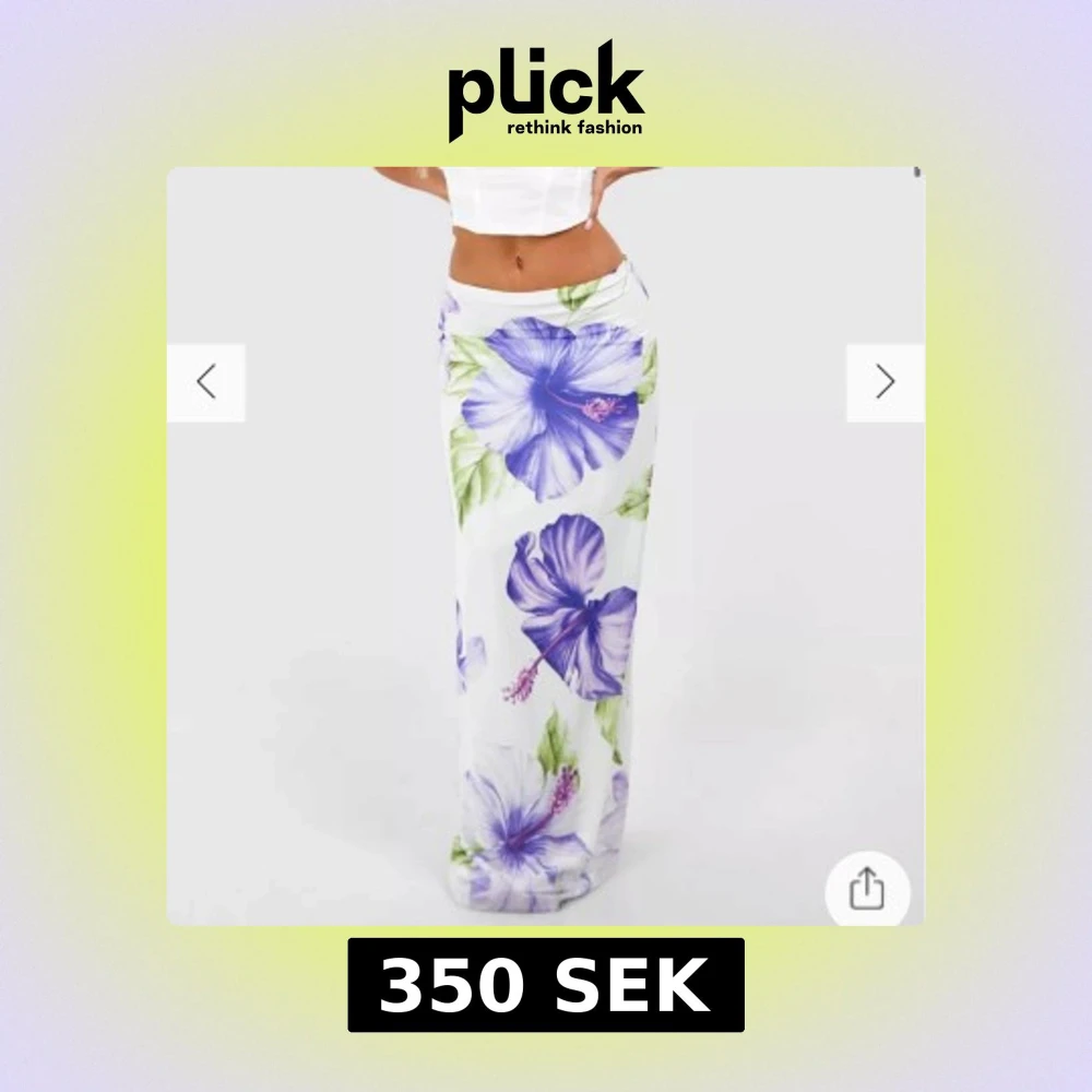 Helt slut! Säljer en vit långkjol med stora lila och blå blommor samt gröna blad. Kjolen har en rak passform och är perfekt för sommarens varma dagar. Den har en hög midja och ett mjukt, flowy material som ger en avslappnad känsla.