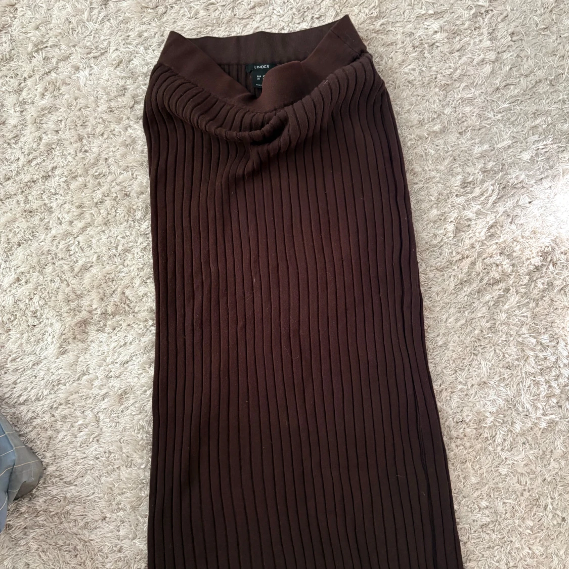 Säljer en mörkbrun, ribbstickad långkjol från Lindex. Kjolen har en hög midja och är figurnära med stretchigt material som är perfekt till höst och sommar.