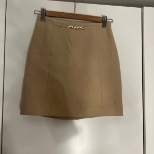 Snygg beige mid-waist pennkjol med gulddetalj fram och dragkedja baktill. Ganska kort och sitter tajt. Kjolen har en enkel och elegant design som går att styla till många olika tillfällen. Har några få noppror som endast syns på nära håll.