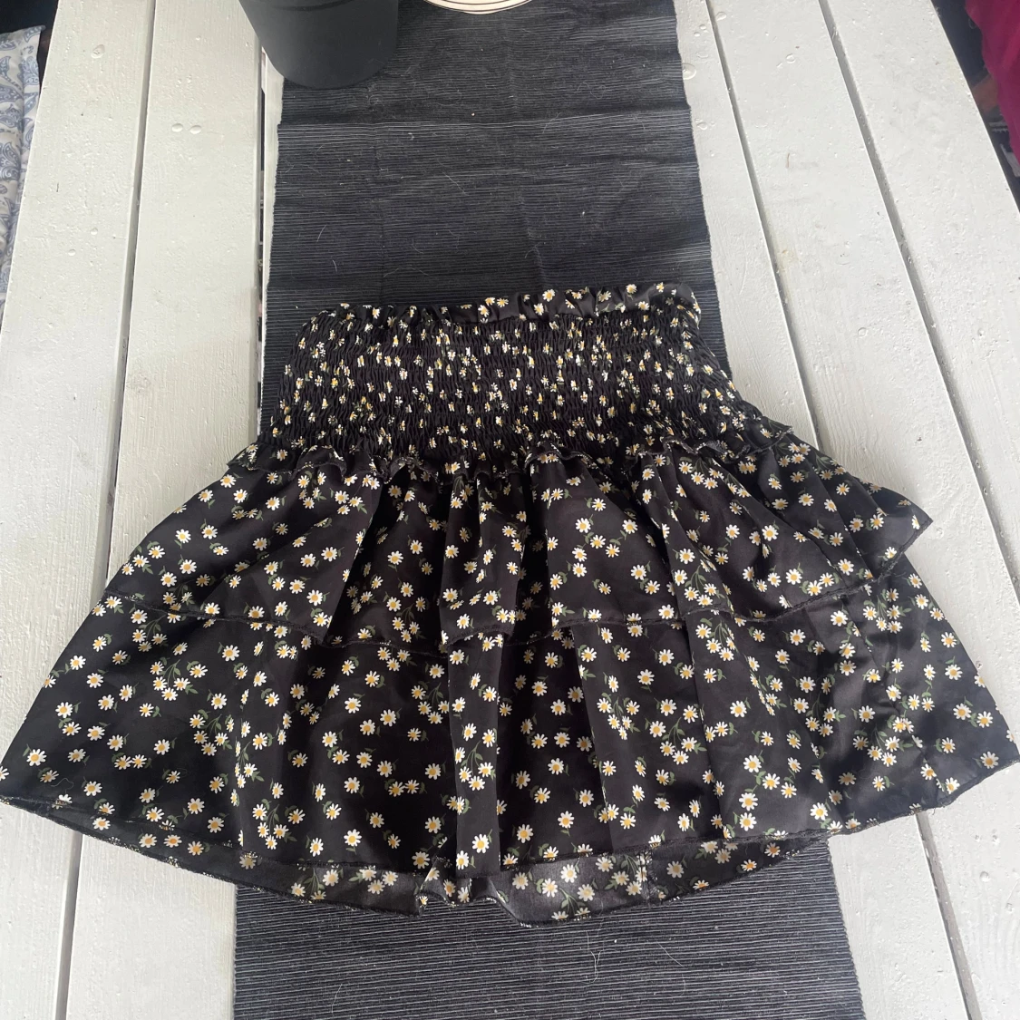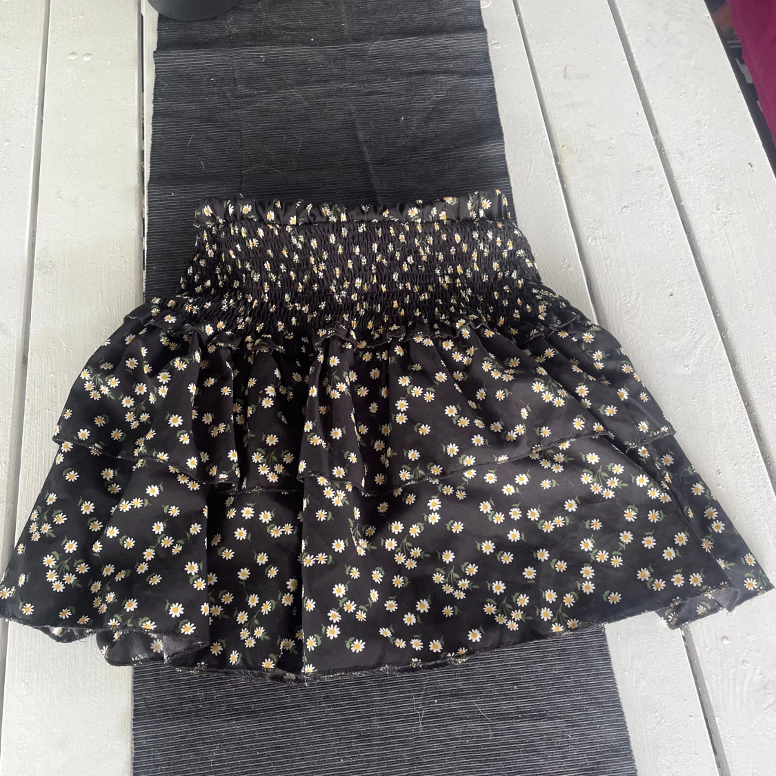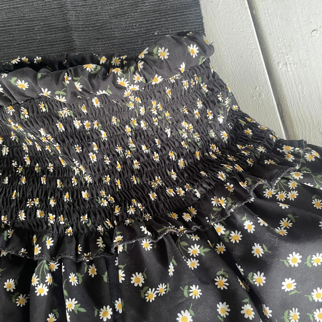 Supersöt svart kortkjol från SHEIN med vita och gula prästkragar. Kjolen har smock i midjan och volangig nederdel som ger en luftig känsla. Perfekt för dig som gillar blommiga mönster och vill ha något bekvämt och trendigt.