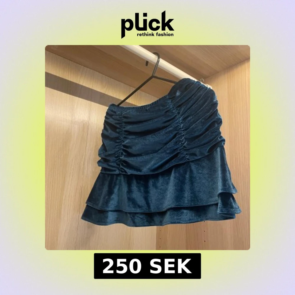 Supersnygg blå sammetskjol, köpt i usa, i kort modell. Kjolen har volangkant och rynkade detaljer framtill som ger en cool och trendig look. Perfekt för dig som vill sticka ut lite extra med en mjuk och glansig känsla. Så skön. Passar xs,s och m då den är stretchig och lite stor i storleken.