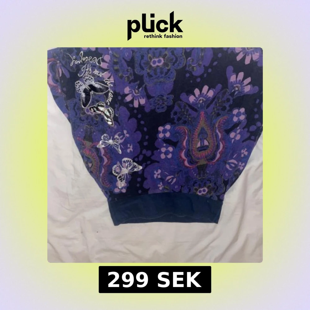 Unik kjol från Desigual i lila och mörkblå toner med blommigt mönster och broderade fjärilar. Tröjan har bred mudd nertill och coola detaljer med text och brodyr. Perfekt för dig som gillar färg och mönster! ( bilden råka bli upp och ned)