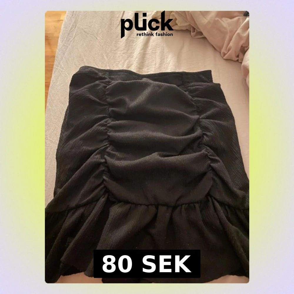 Säljer en svart kortkjol med snygga rynkade detaljer och volang längst ner. Kjolen har en tight passform och är gjord i ett mjukt tyg som känns bekvämt.