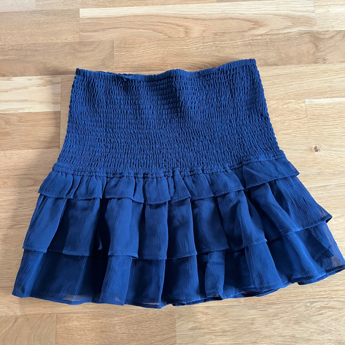 Supersöt mörkblå kortkjol med smockad midja och flera lager volanger. Kjolen har en luftig känsla och passar perfekt till sneakers eller boots. Materialet känns lätt och stretchigt, vilket gör den extra bekväm och snygg.