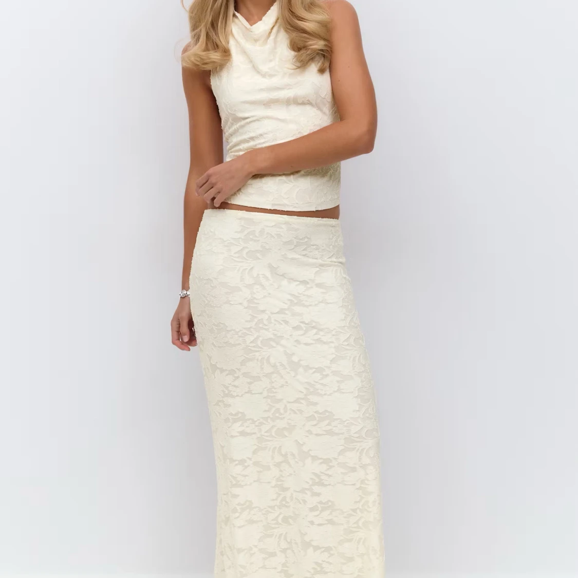 Otroligt fint set från Gina Tricot i vit/beige färg🤍🤍 Toppen är storlek M och kjolen är storlek S. Aldrig använt!! Modellen heter Floral Maxi Skirt och topp 🤍