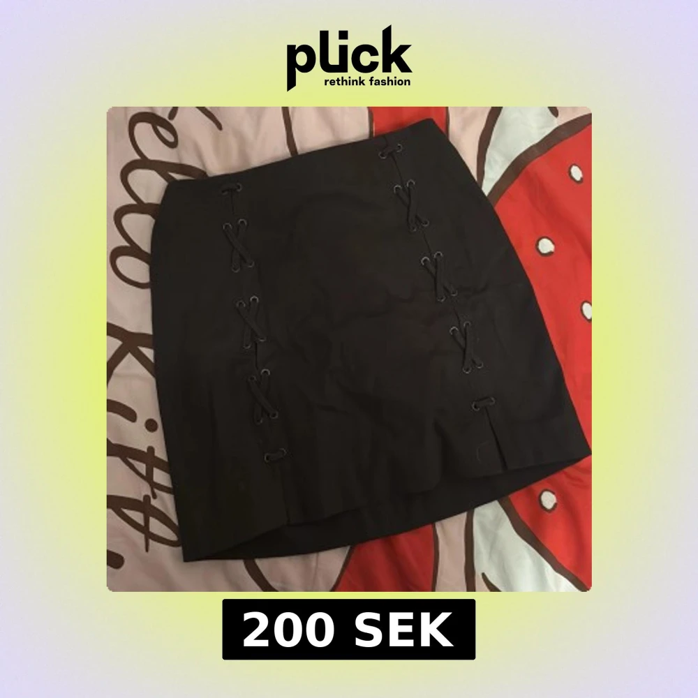 Svart kortkjol från H&M i storlek 32. Kjolen har coola snörningsdetaljer framtill och en dragkedja bak. Stilren och edgy design som passar perfekt till sneakers eller boots. Materialet känns mjukt och följsamt.