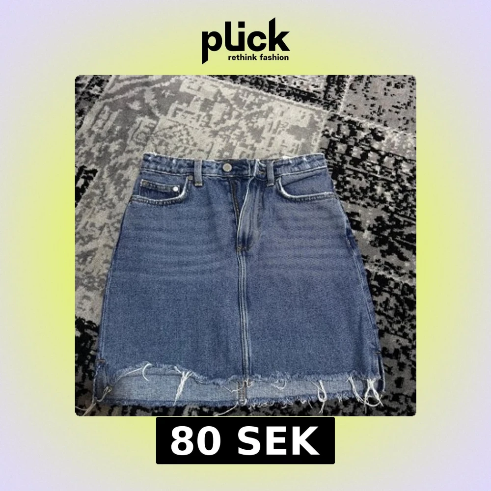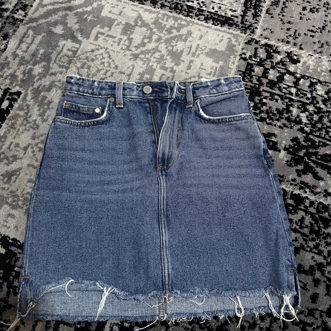 Snygg jeanskjol från H&M i klassisk blå denim. Kjolen har en rå kant nertill och femficksdesign med bälteshällor. Perfekt för en avslappnad stil.
