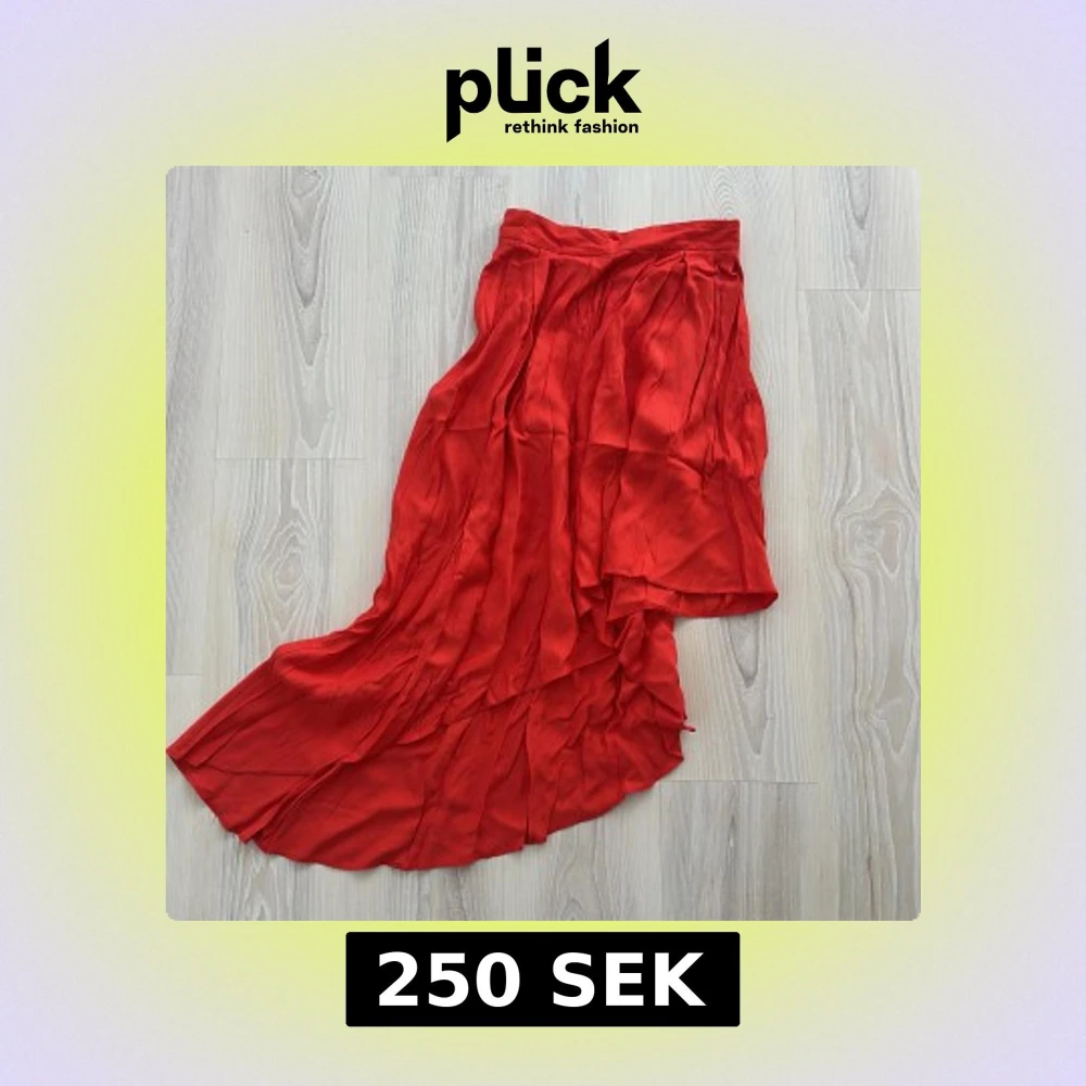 Säljer en röd långkjol från H&M med omlott-design och snygga veck. Kjolen har en asymmetrisk nederkant som ger en cool och flowy look. Materialet är mjukt och glansigt, vilket gör att kjolen faller snyggt och känns skön att bära.