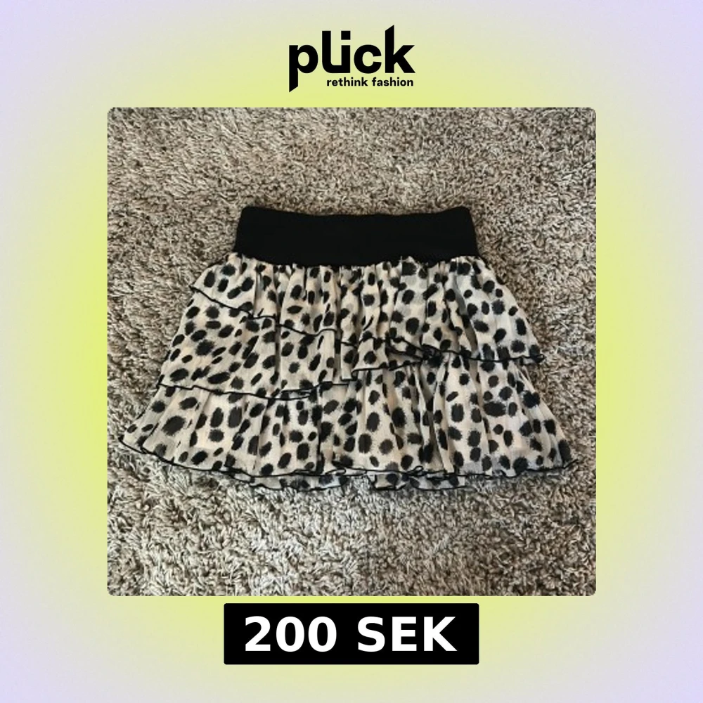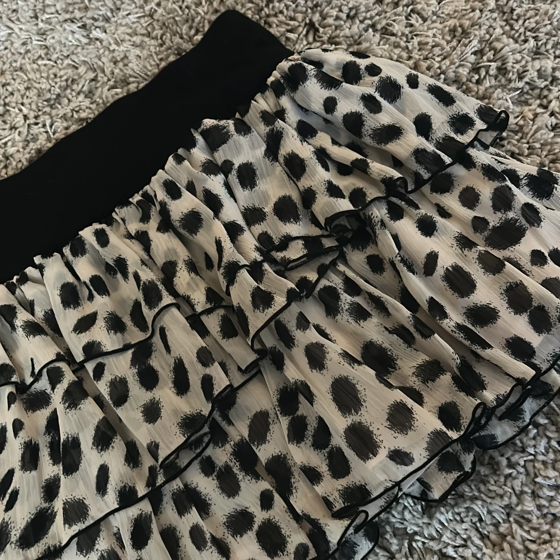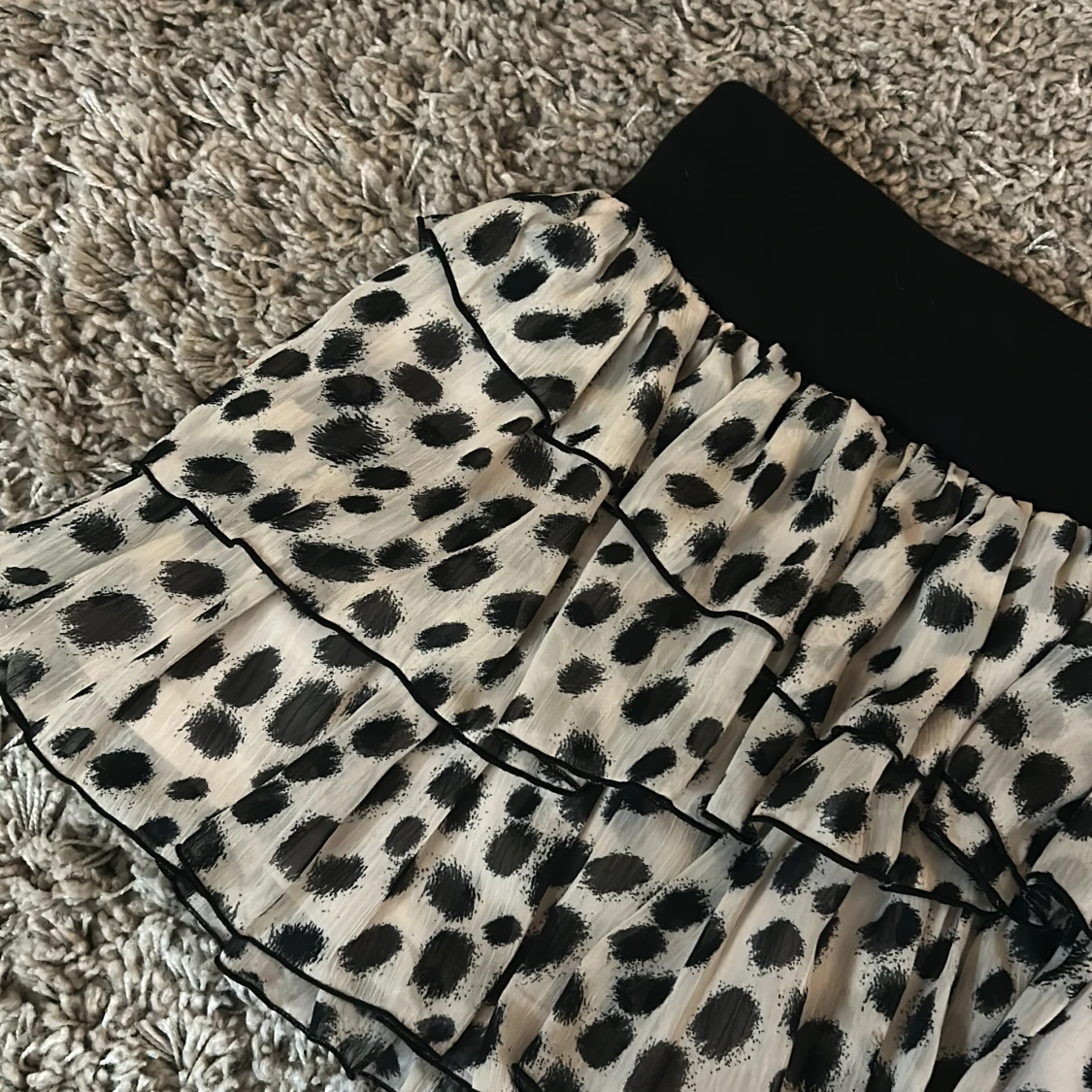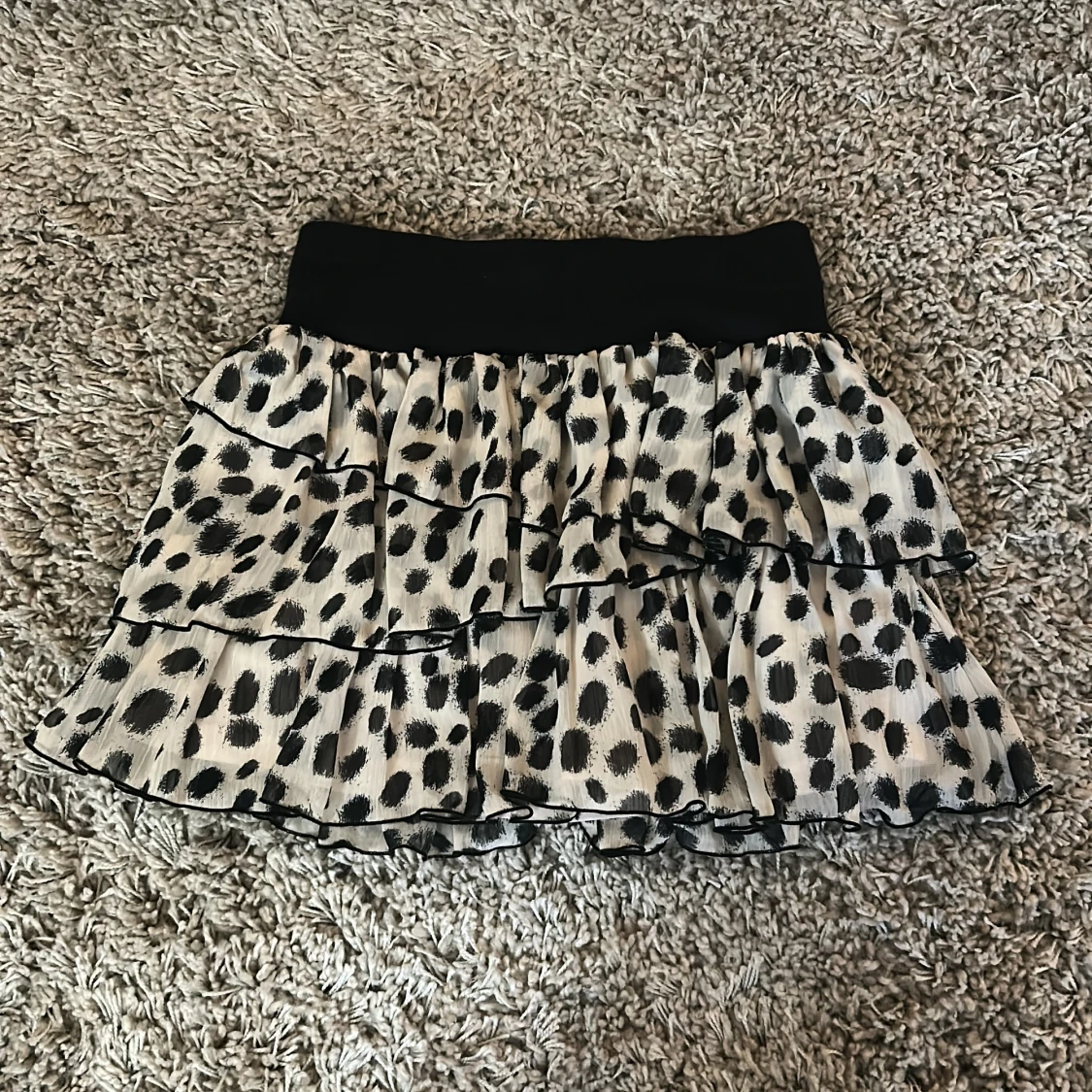 Supersöt kortkjol med svart resårmidja och flera lager volanger. Kjolen är vit med stora svarta prickar och har en luftig, flowy känsla. Perfekt för dig som gillar att sticka ut med ett lekfullt mönster och voluminös look.