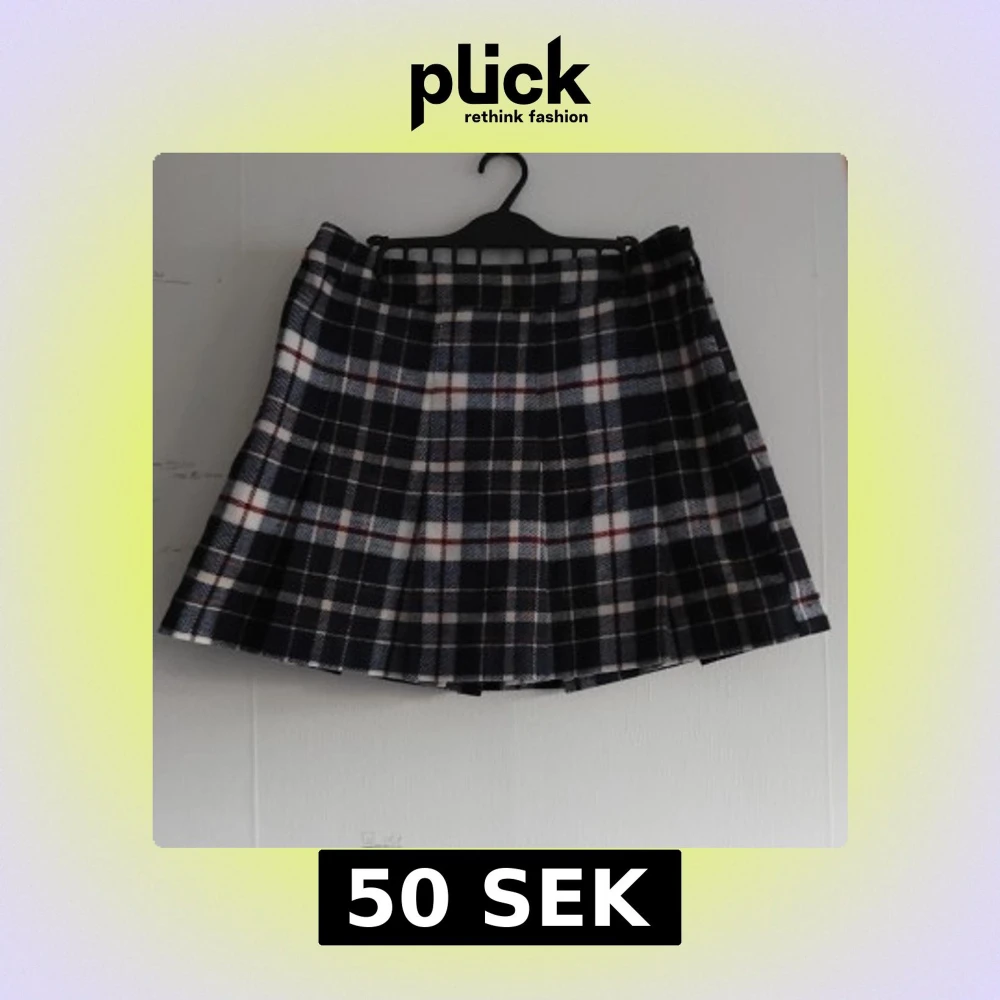 En rutig kjol i marinblå, röd och vit från H&M. Har shorts under. Above knee, veckad och högmidjad. Aldrig använd