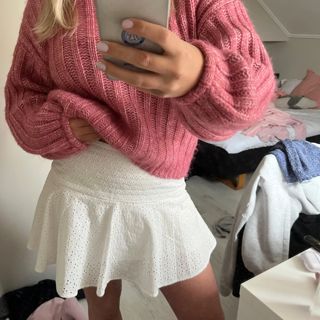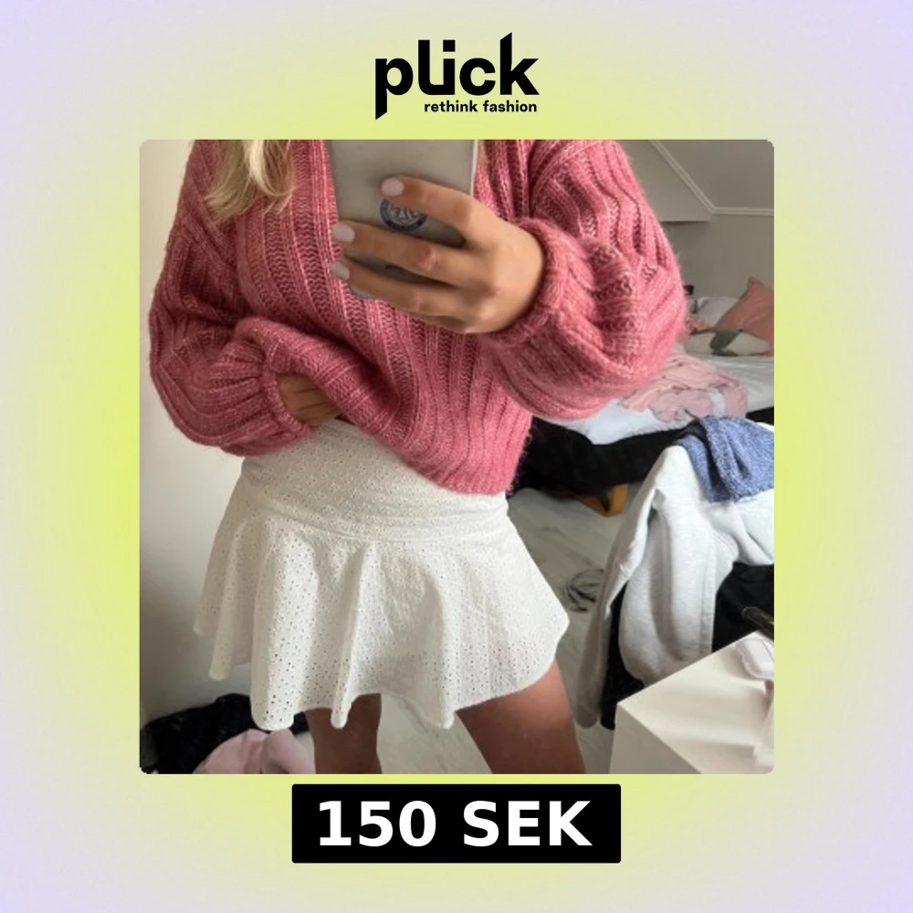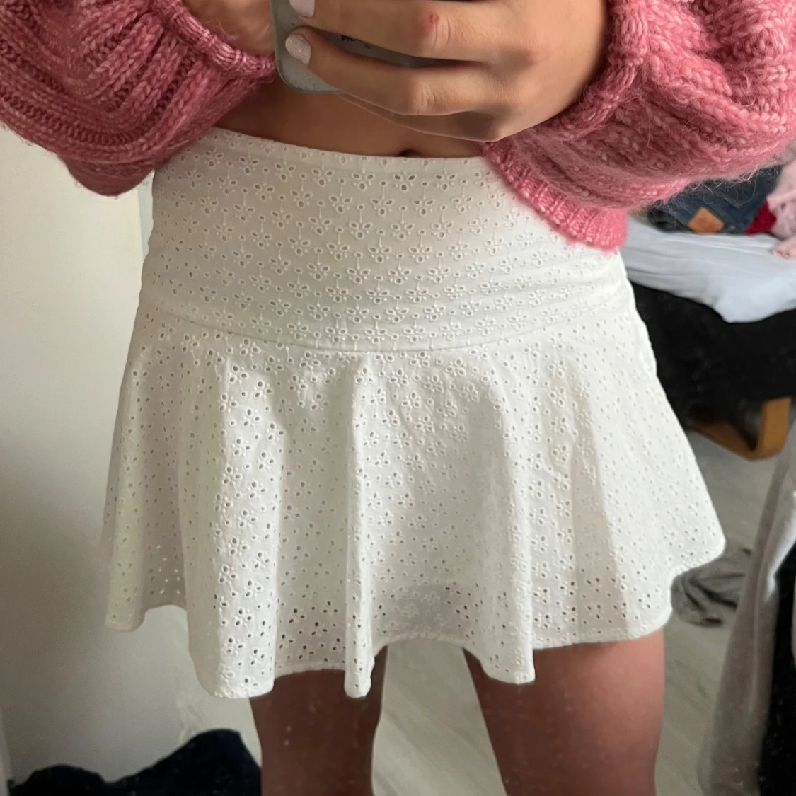 Säljer en söt vit kort kjol med broderade blommönster och lätt utsvängd form. Kjolen har en bred midja och är perfekt för varma dagar. Superfin att styla med stickad tröja eller crop top.