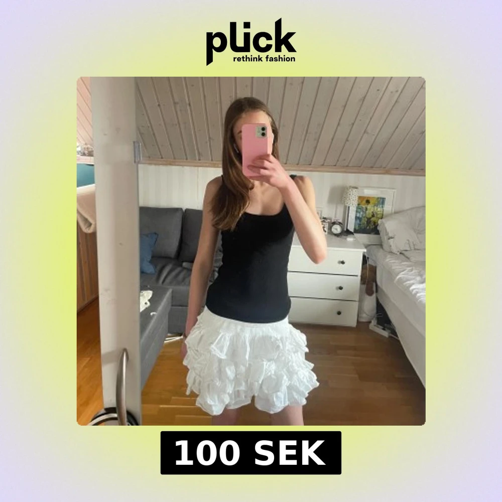 Supersöt vit kortkjol från H&M med flera lager volanger och smockad midja. Kjolen är i tunn bomull och har en luftig känsla som passar perfekt till varma dagar. Enkel att styla med crop top eller oversized t-shirt för en chill vibe.