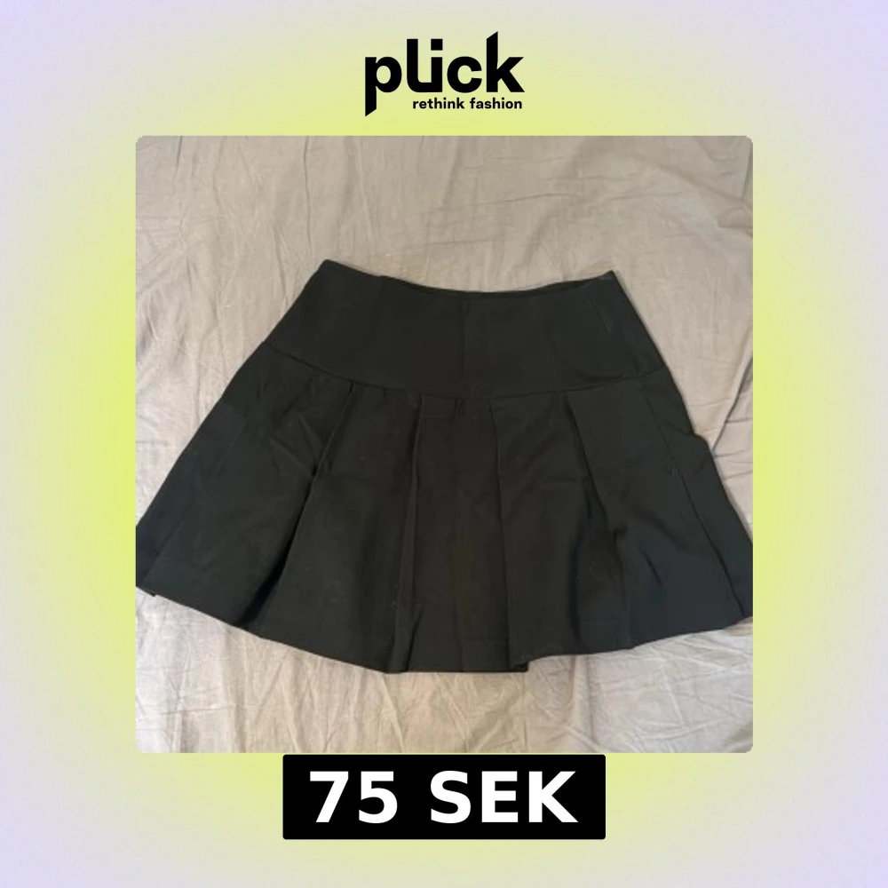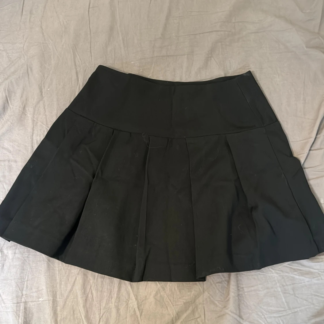 Snygg svart kortkjol med bred linning och plisserade detaljer som ger extra volym. Kjolen har en klassisk och stilren look, perfekt att matcha med en crop top eller oversized hoodie. Materialet känns mjukt och följsamt.