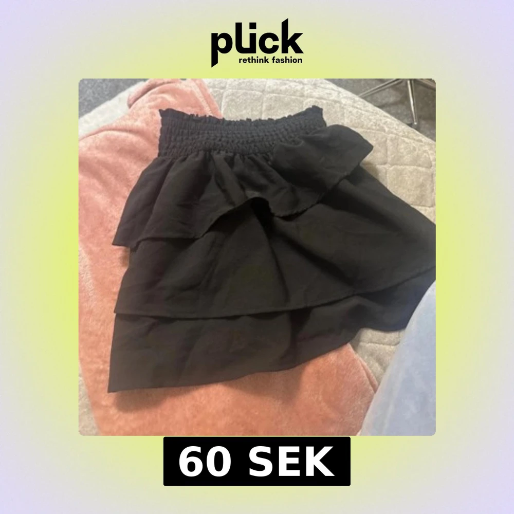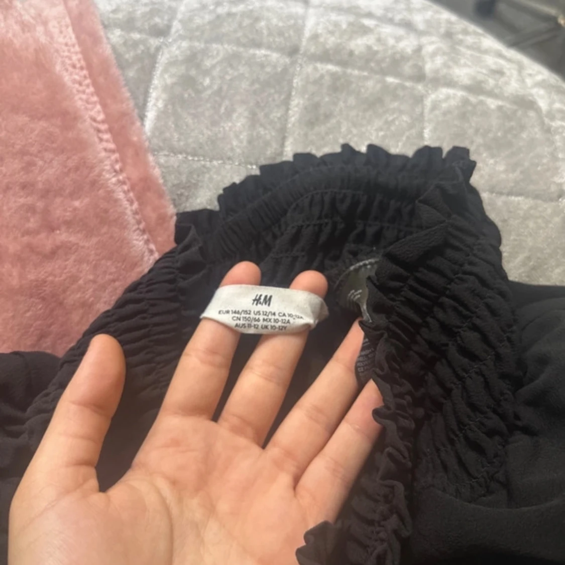 Supersöt svart kjol från H&M med bred smock i midjan och dubbla volanger. Perfekt för dig som gillar en feminin och trendig stil. Kjolen är kort och har en flowy känsla. Storlek är 146/152 men passar mig som har mellan 32-26 eller XXS och XS och särkert S. Aldrig använd pga jag tycker den är lite kort.