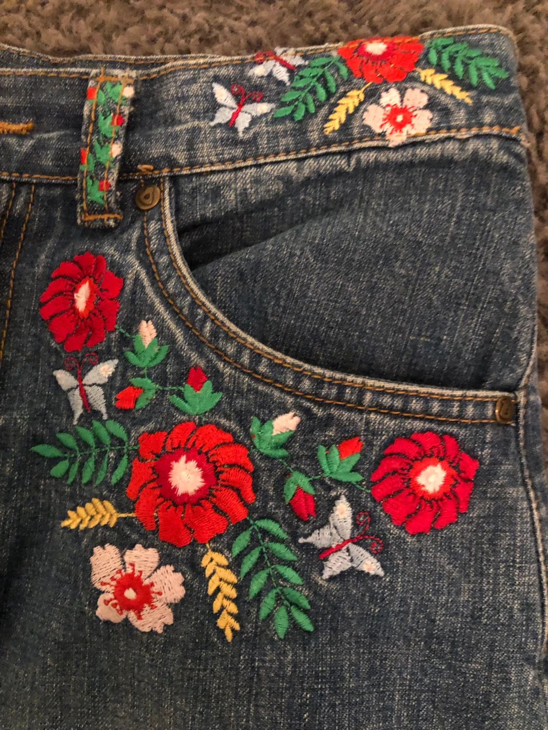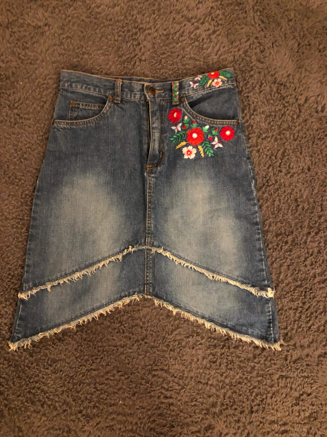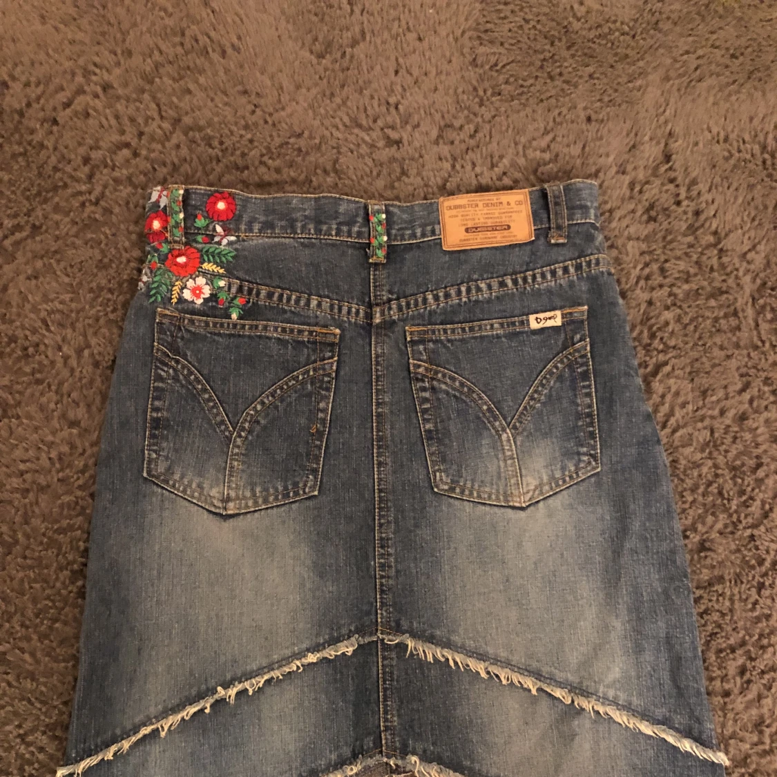 En lite längre jeans kjol med väldigt fina och unika blom detaljer både bak och fram
