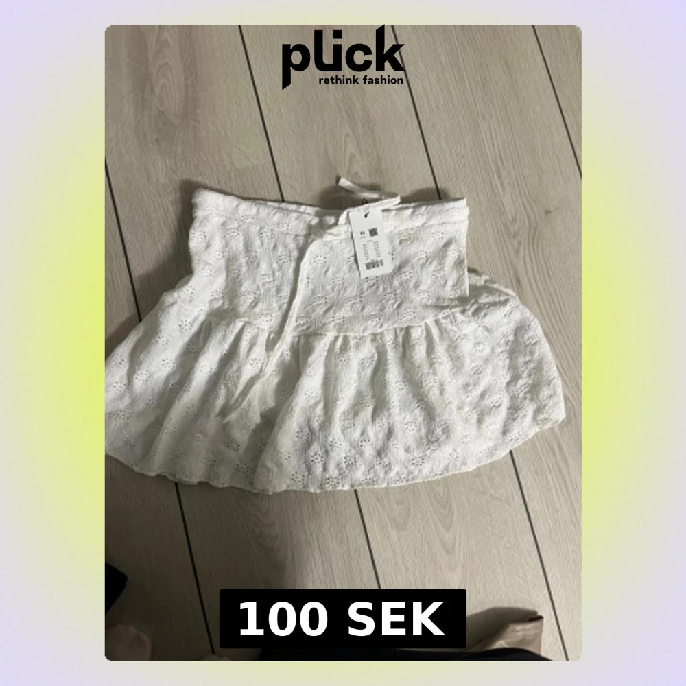 Superfin vit kortkjol från H&M med broderade blommor och volangkant. Kjolen har omlottkänsla och knytband i midjan för extra snygg passform. Perfekt för varma dagar och ger en fräsch och somrig vibe.