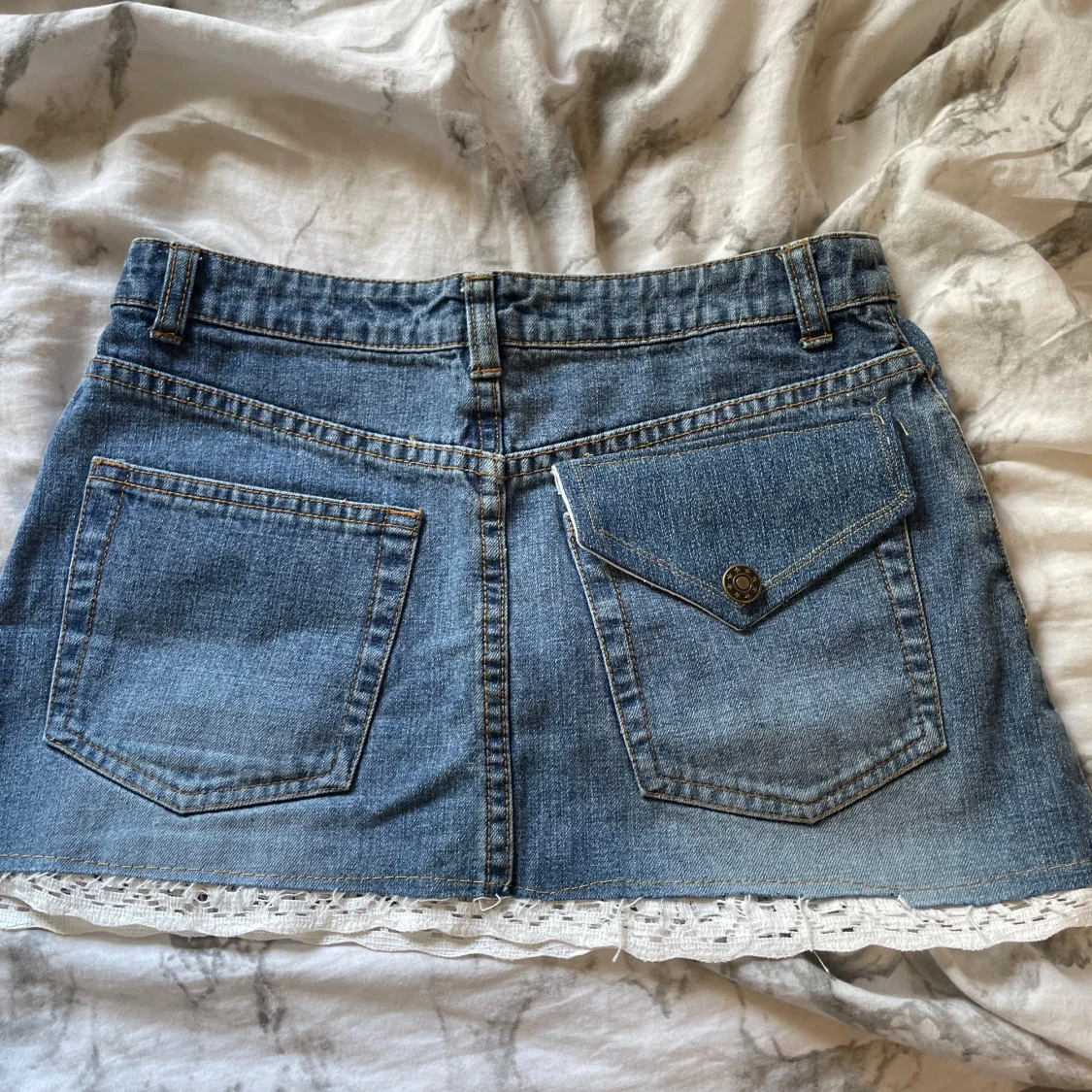 Kort jeans kjol med vit spets, från hm