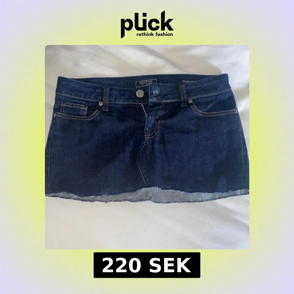 Snygg mörkblå jeanskjol från Guess med rå kant. Omsydd från ett par jeans och är lågmidjade. Ungefär storlek S
