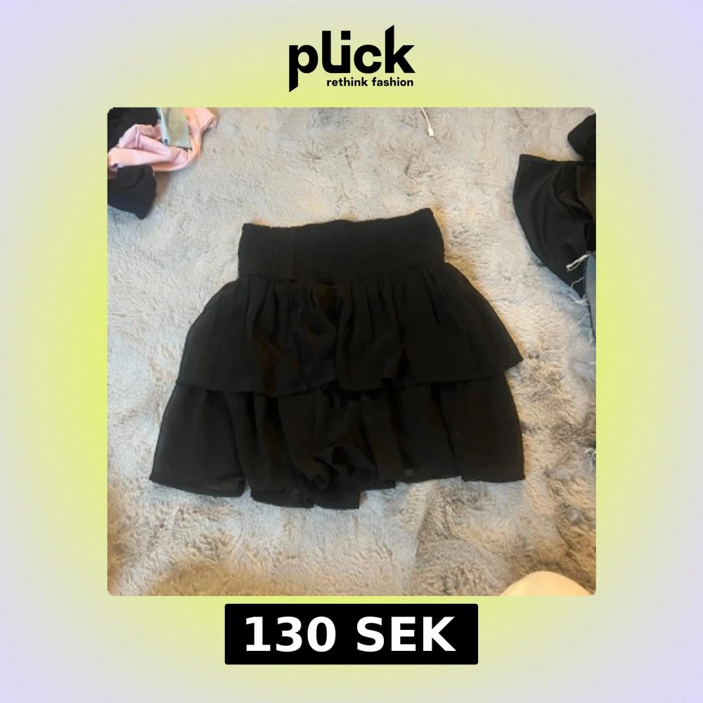 Supersöt svart kortkjol med dubbla volanger och bred smockresår i midjan. Kjolen är luftig och flowy, perfekt för att skapa en chill och trendig look. Passar lika bra till en croppad topp som till en hoodie.