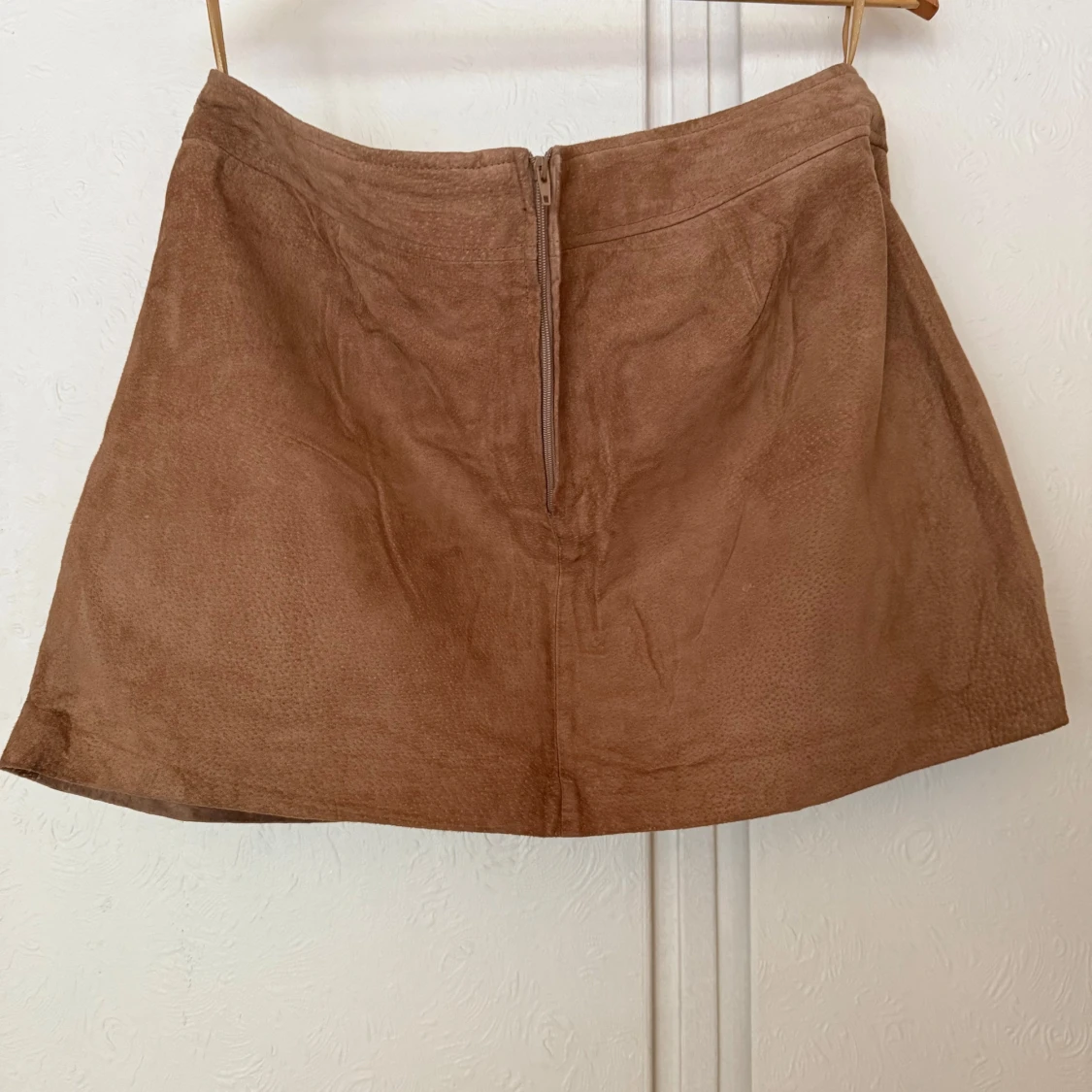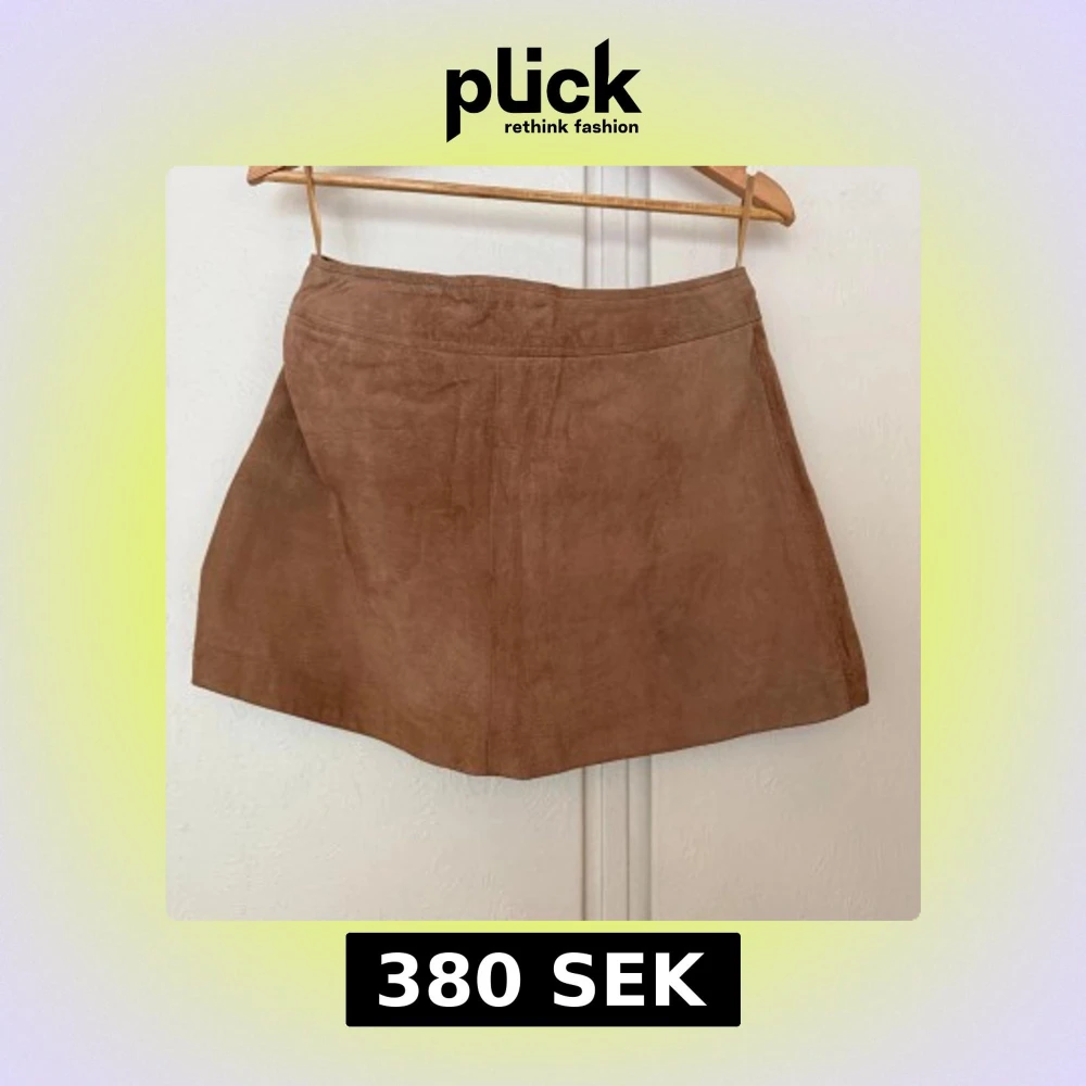Snygg brun kortkjol i äkta mocka från Lindex. Kjolen har en enkel A-linjeform och stängs med dragkedja bak. Perfekt för dig som gillar en klassisk och stilren look med en touch av 70-talsvibe. Mått:Midja 88 cm, höft 104, längd 36,5