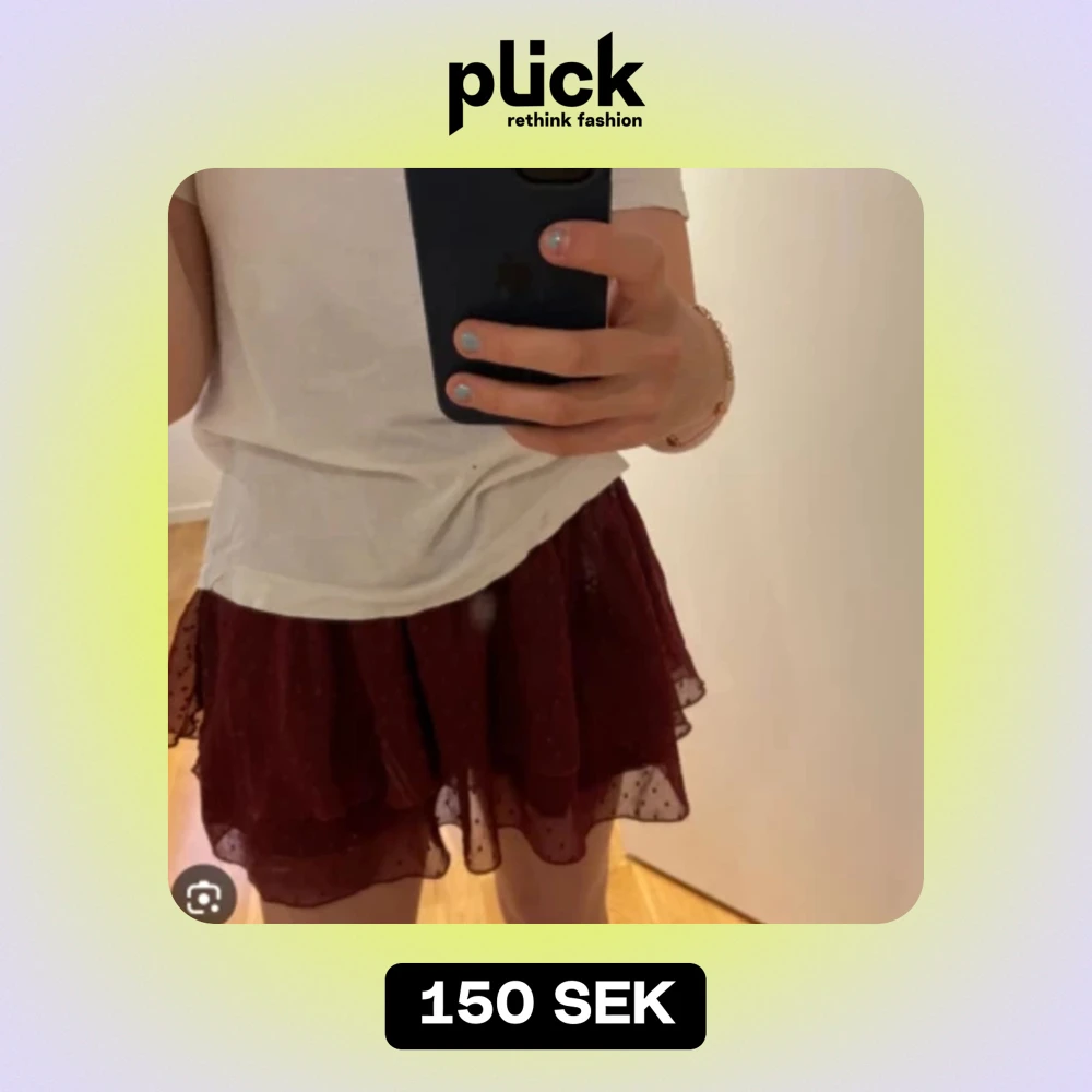 Jätte söt vinröd volangkjol som man kan ha som kjol eller topp. Brukar vika ner den så den blir lågmidjad!