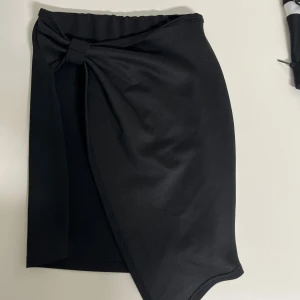 Snygg svart omlottkjol med en elegant rosett i midjan. Kjolen har en stilren design och är perfekt för att skapa en chic look. Den är kort och passar bra till olika tillfällen.