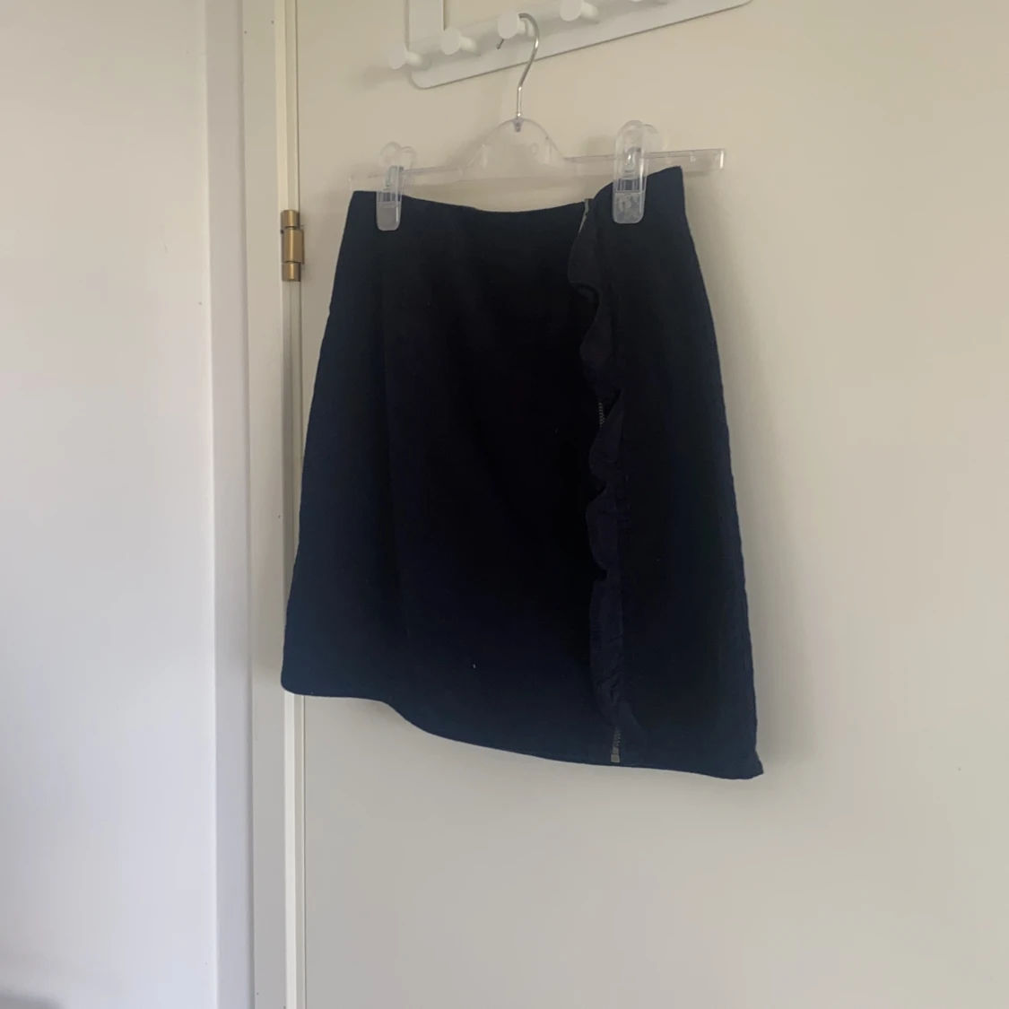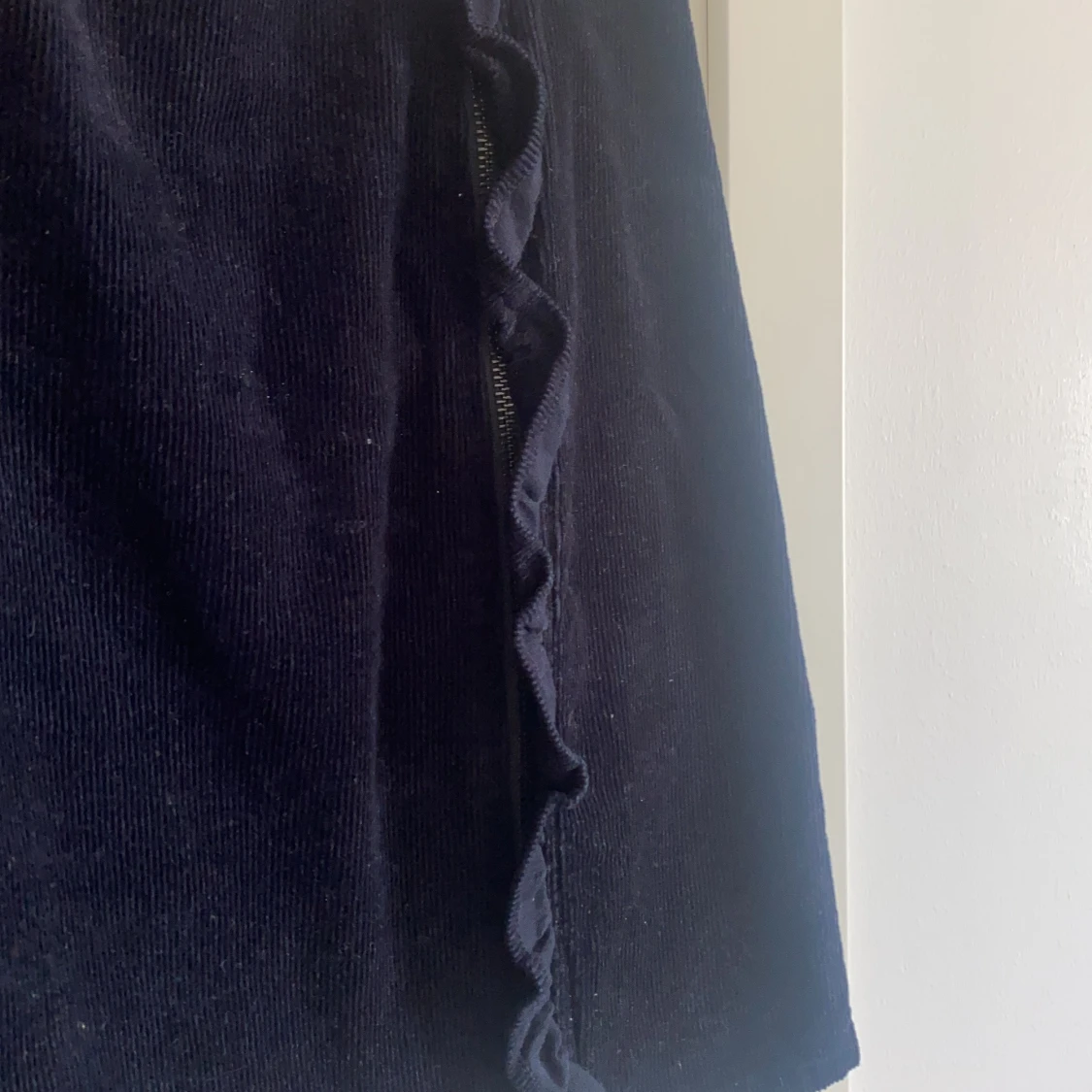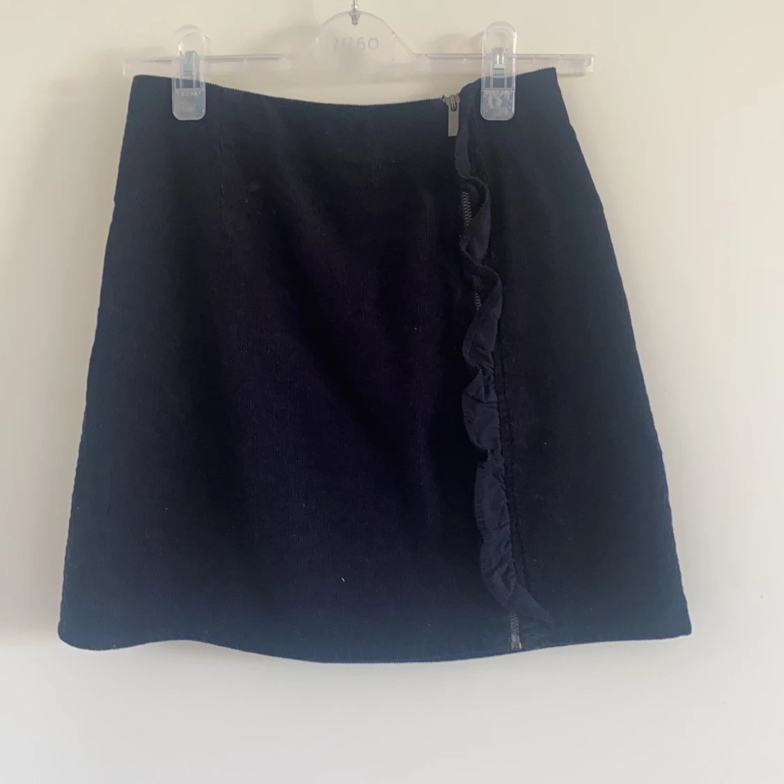 Säljer denna oanvända svarta manchesterkjol med fin volangdetalj och dragkedja