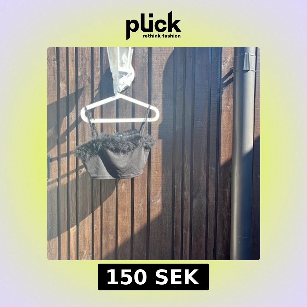 Supersnygg svart bandeau topp med smala axelband och fluffig fuskpäls längs överkanten. Perfekt för dig som vill sticka ut med en trendig och lekfull look. Toppens material är mjukt och har en lätt glans, vilket ger en extra cool känsla. PLUS EN KJOL I SAMMA STIL