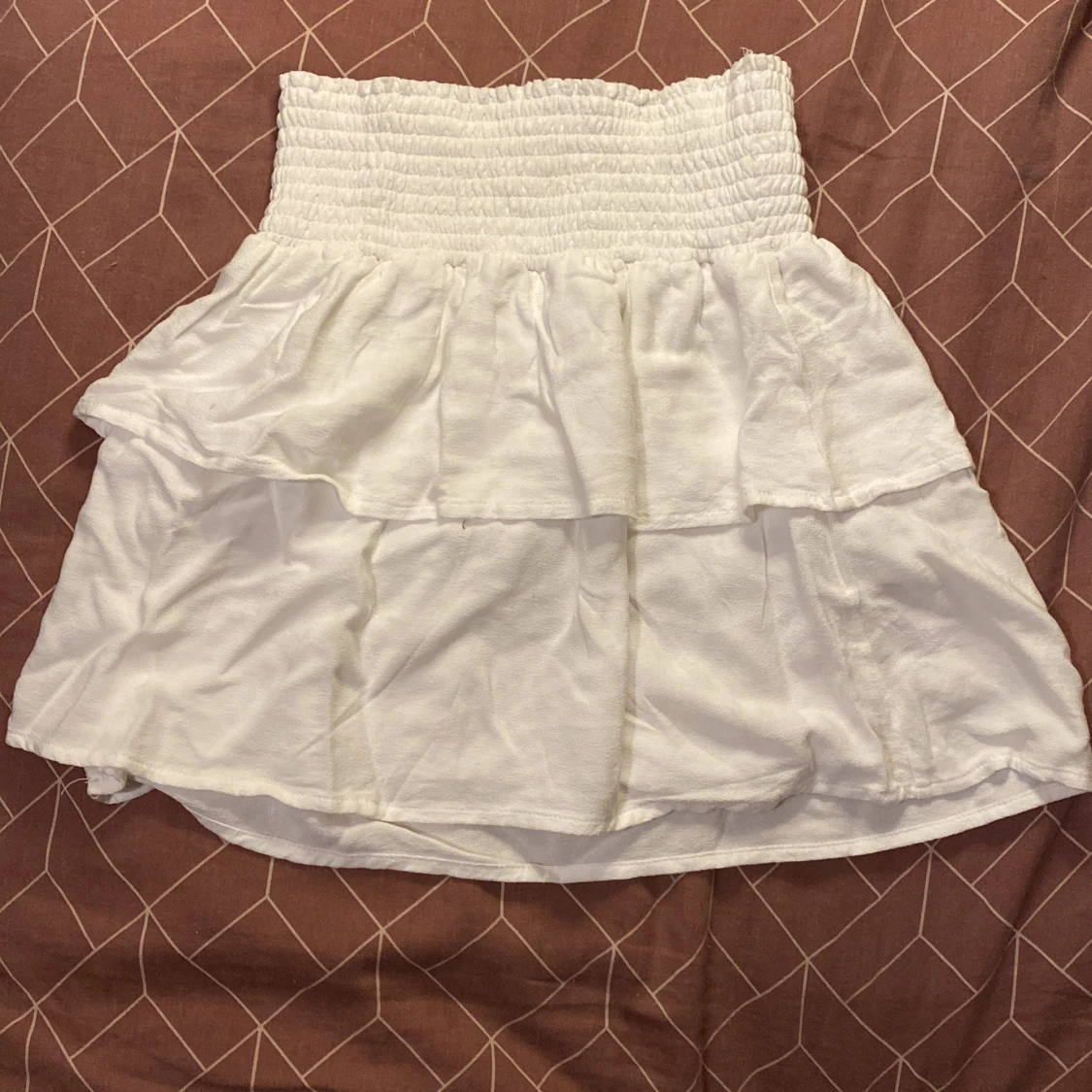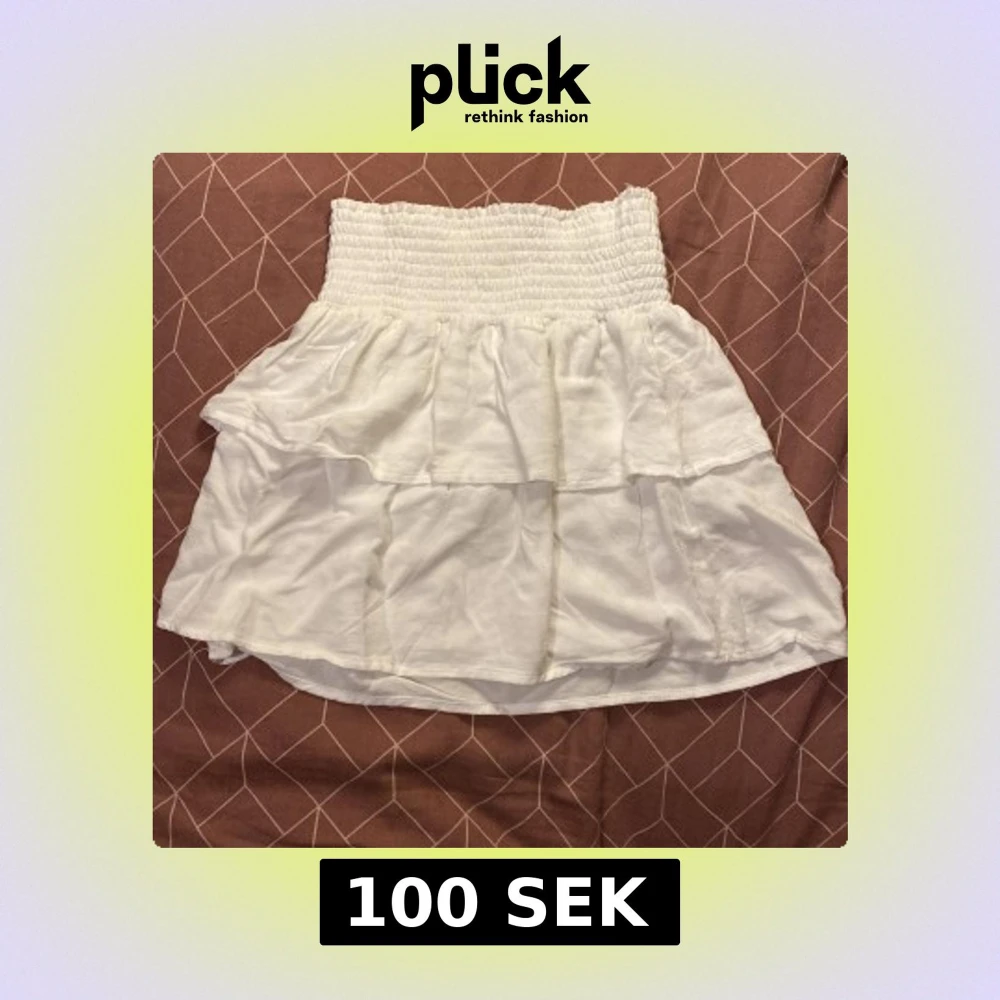 Supersöt vit kortkjol från 157 med bred smock i midjan och dubbla volanger. Kjolen är luftig och har en flowy känsla, perfekt för varma dagar. Enkel att matcha med crop tops eller t-shirts för en chill look.